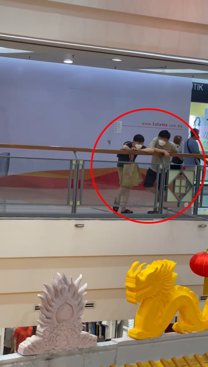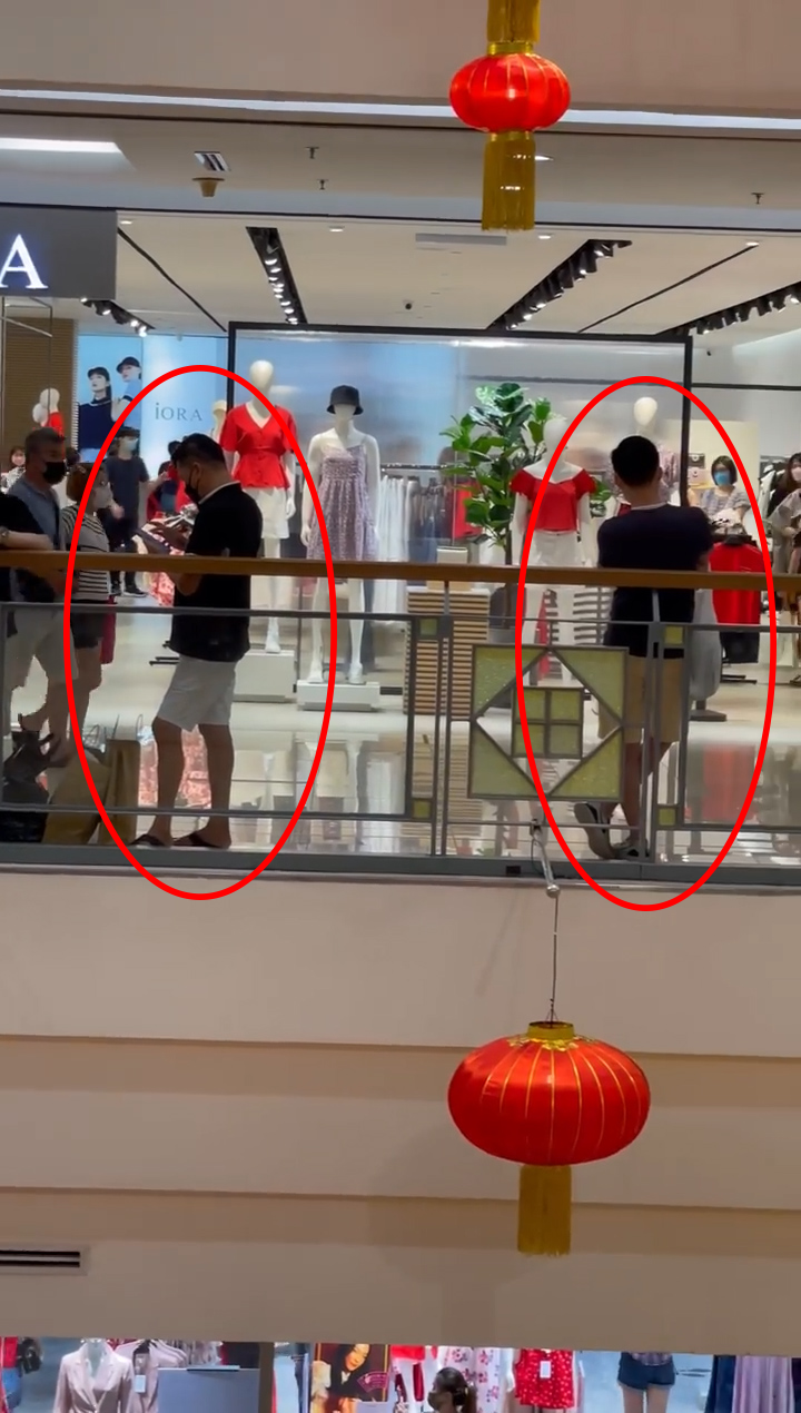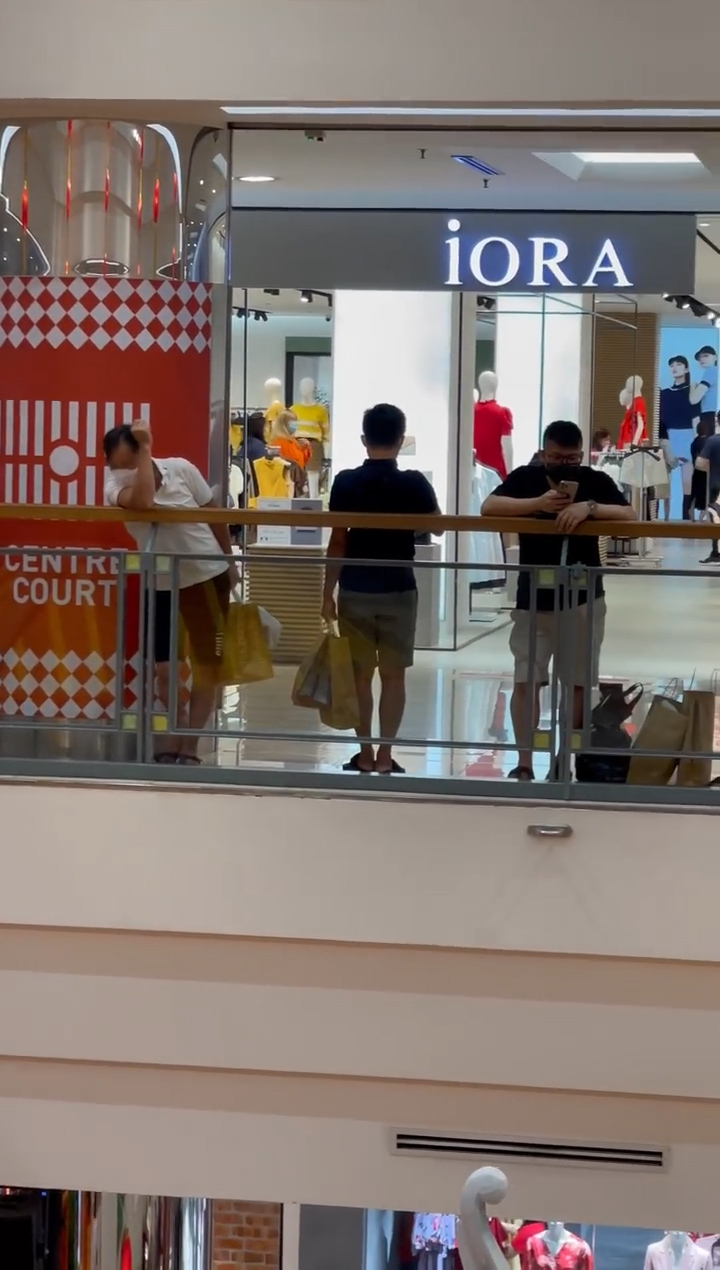 ▼ 拍摄者拿着手机缓缓地从左边拍到右边,一排看过去全是一样的场景!男人们有些还是老公带着儿子一起站在栏杆旁边,一边拿着一袋袋的“战利品”一边站着滑手机等。