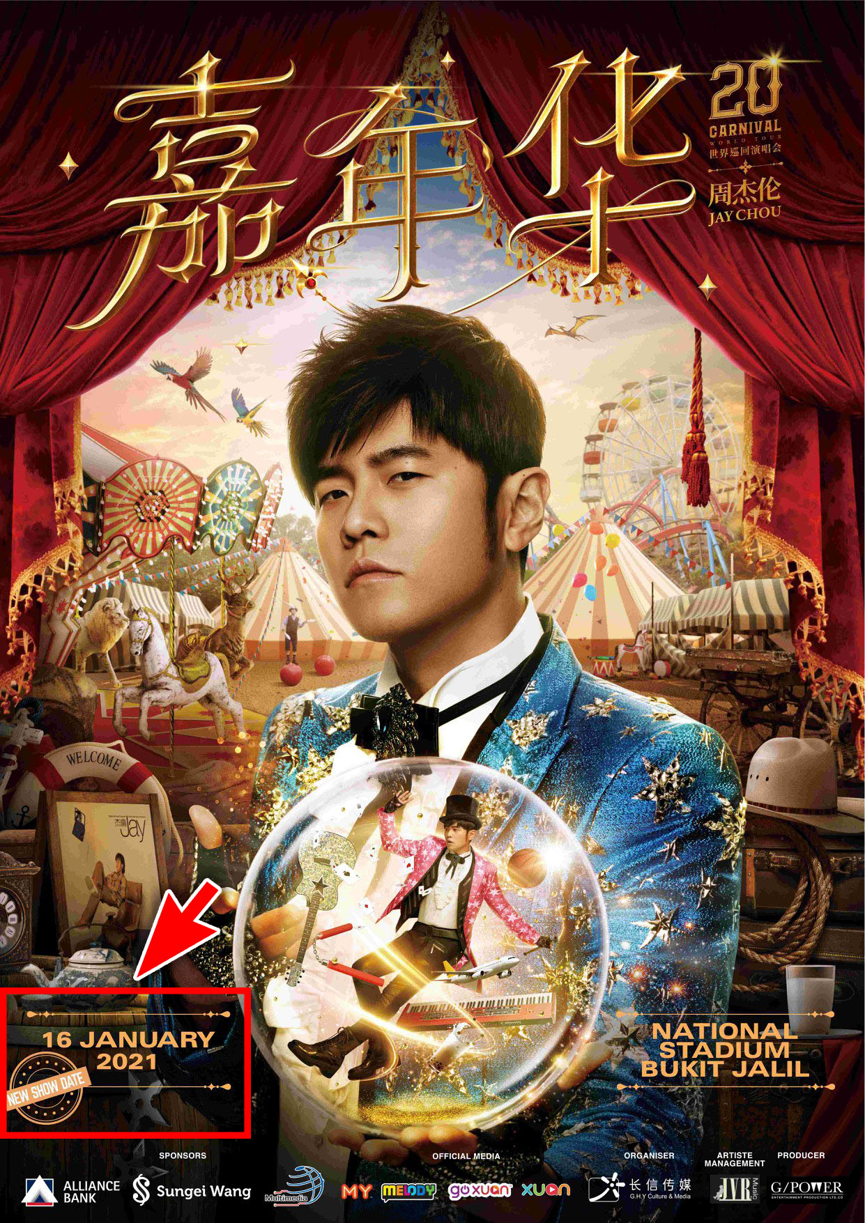周杰伦《嘉年华》世界巡回演唱会-马来西亚(吉隆坡站)原定在2020年2月29日举办,当时大马爆发新冠疫情导致演唱会被迫宣布延迟一年,也就是2021年的1月16日,期待已久的歌迷们也只能苦苦等待。