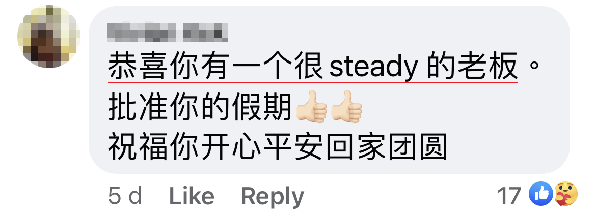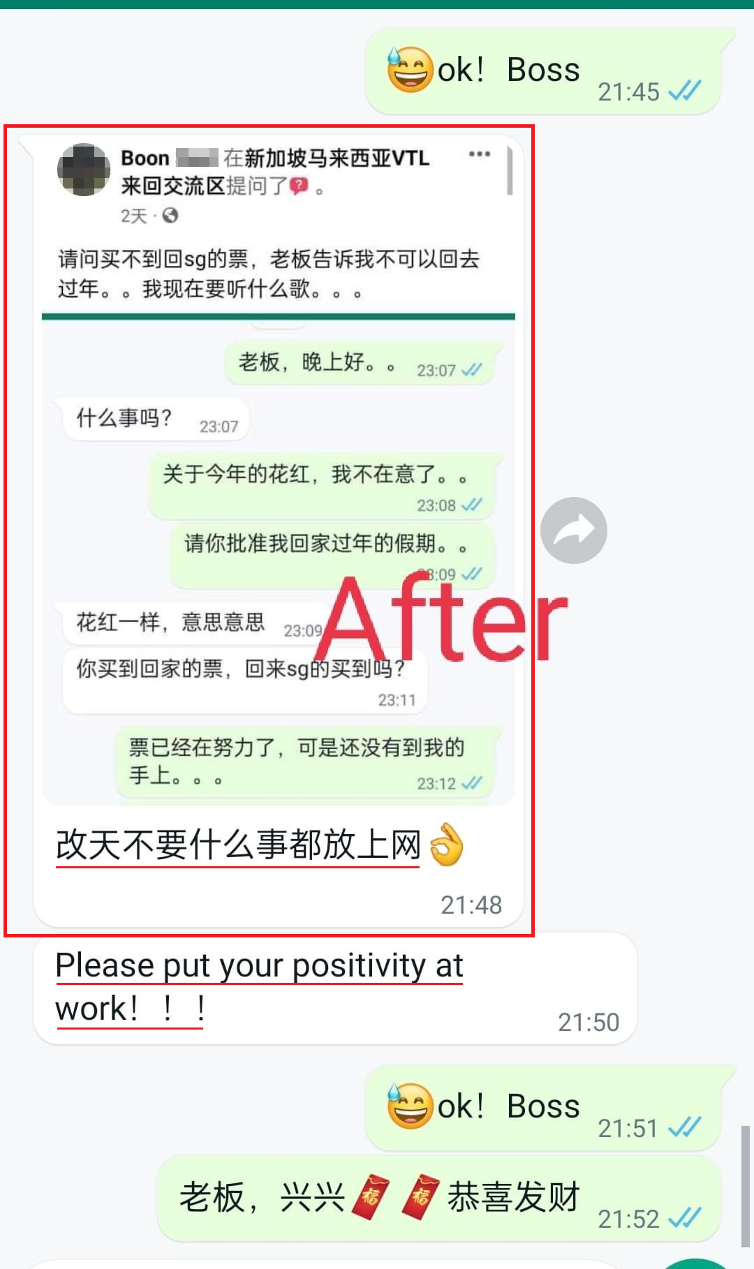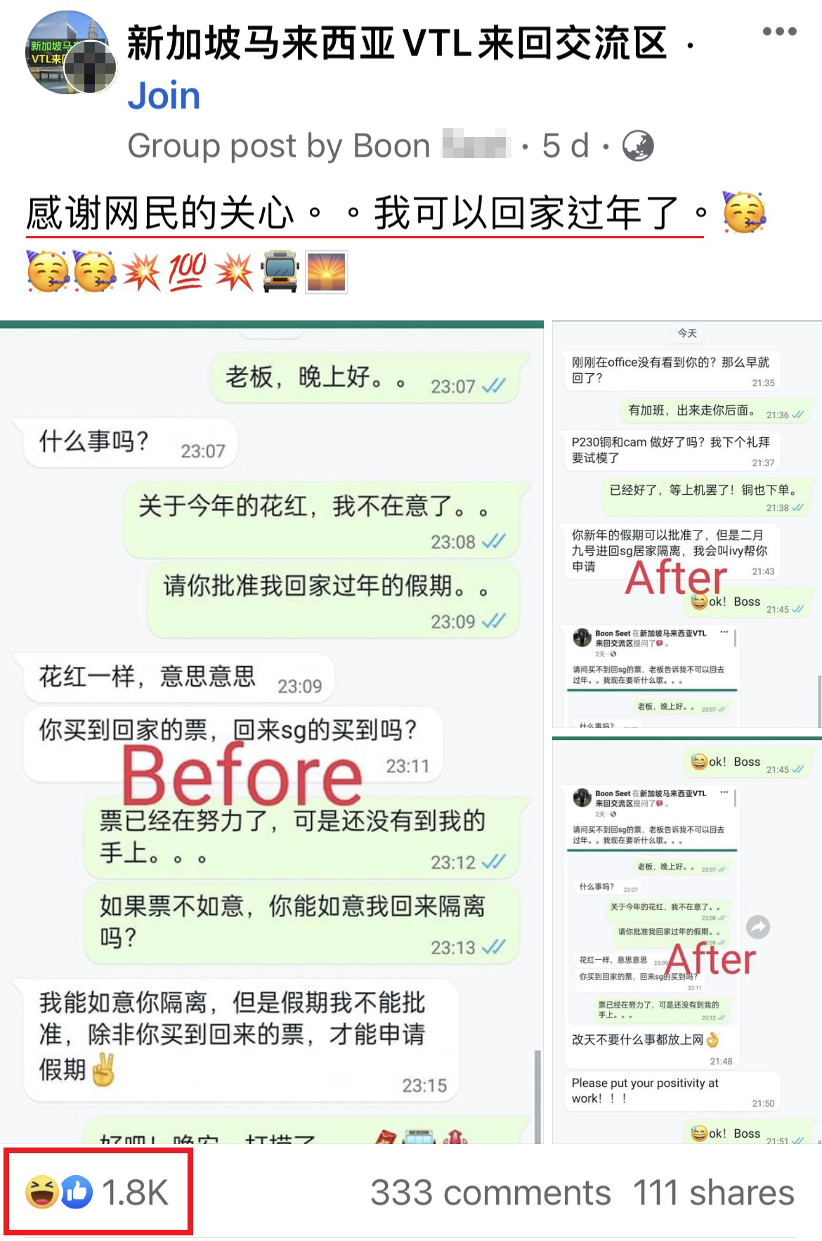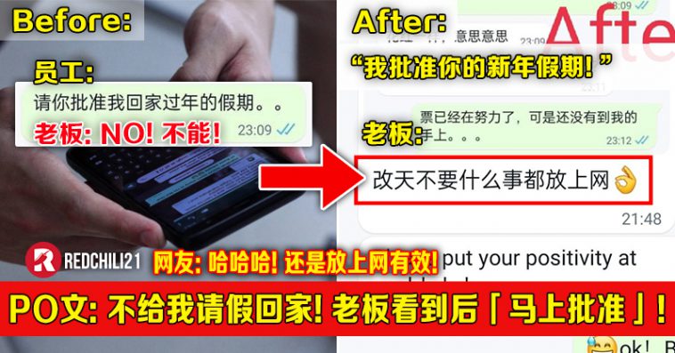 随后该名男子在群组PO文更新消息,老板已经批准他的假期让他回家过年,老爸之所以改变主意是因为他看到了员工的帖文!
