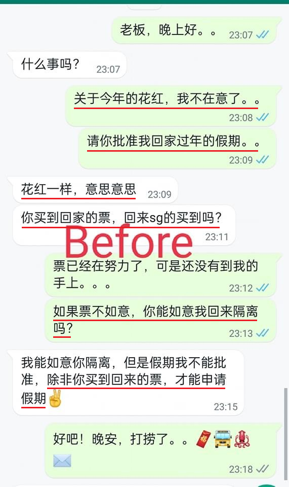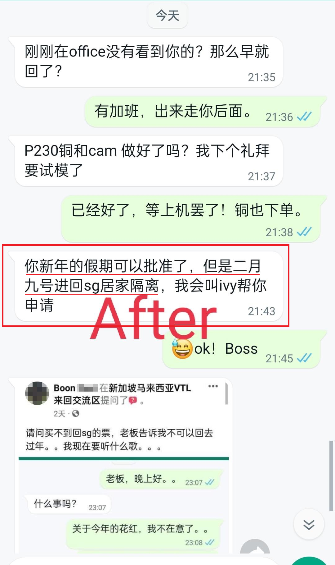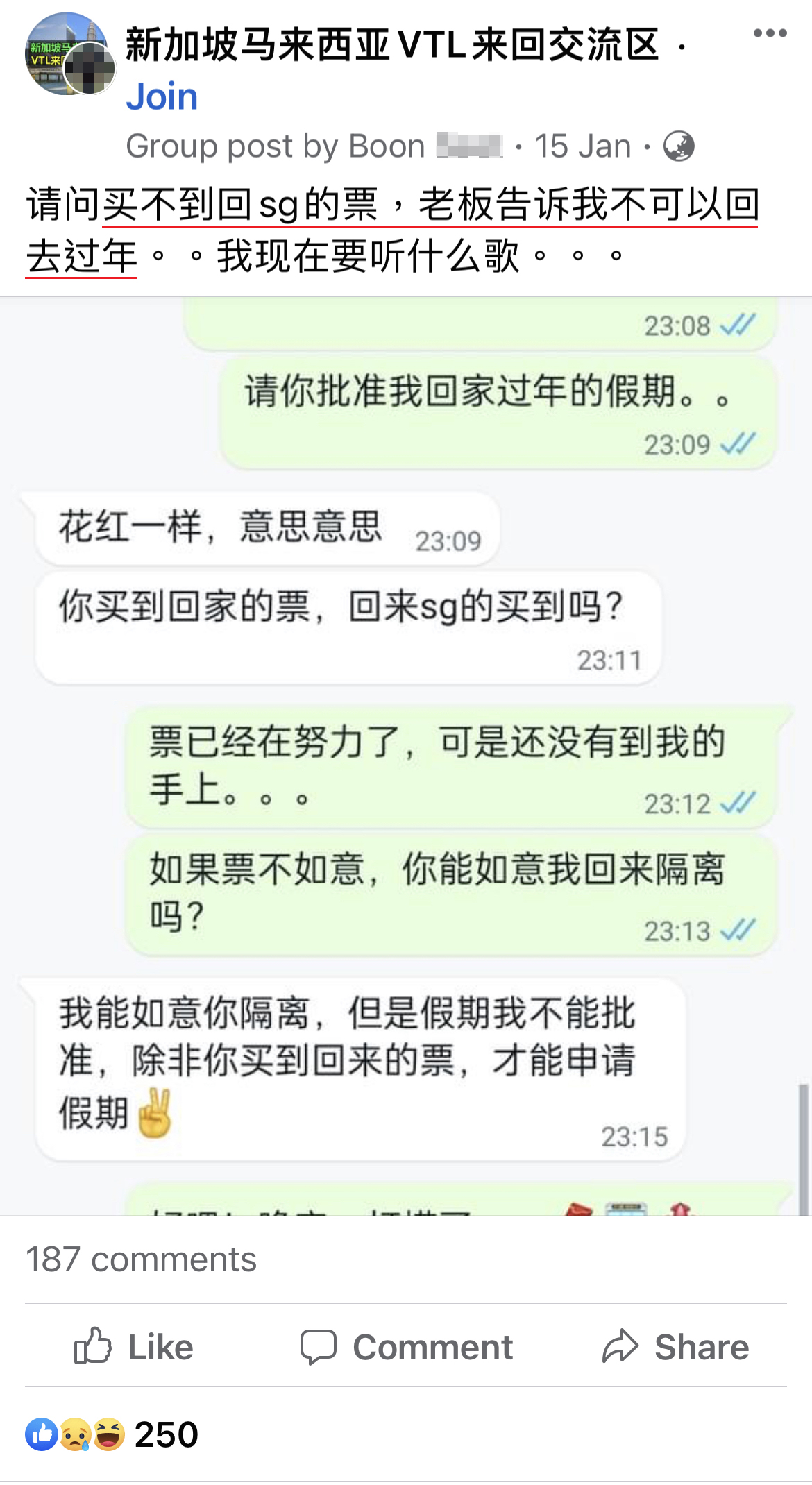 一名在新加坡打工的大马男子近日在脸书群组吐露自己的伤心事,老板不批准他回家过年的假期,帖文还附上他和老板的 WhatsApp 对话截图。