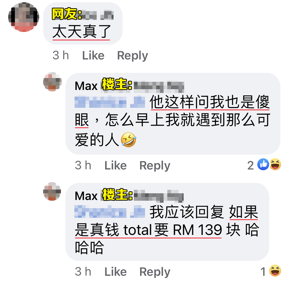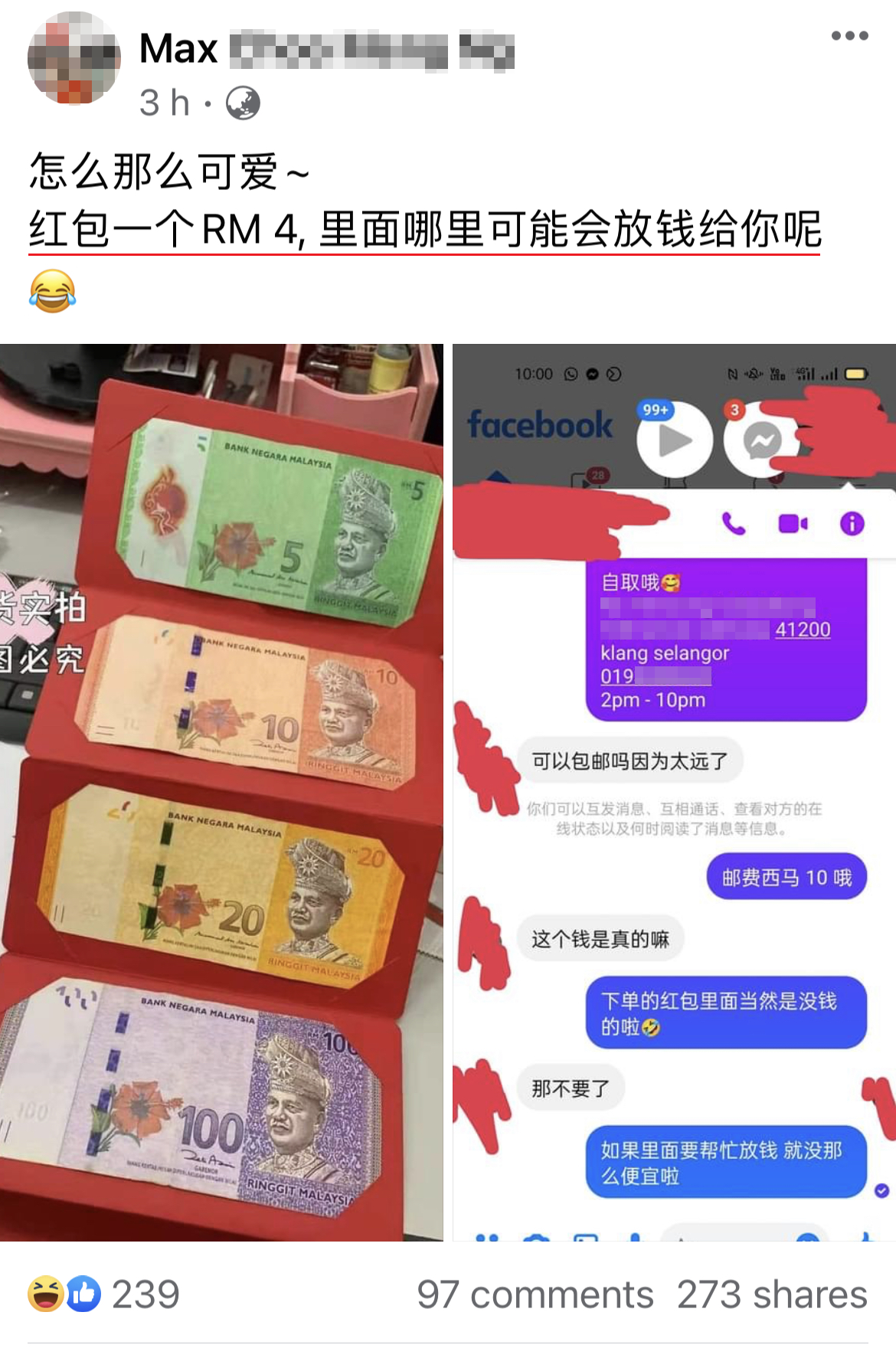 该名大马卖家日前在脸书发帖售卖新年折叠红包,商品图片中的折叠红包放了RM5、RM10、RM20、RM50各一张真钞做为示意,而折叠红包的售价是RM4。结果没想到真的有人以为买红包就送里面的钞票!