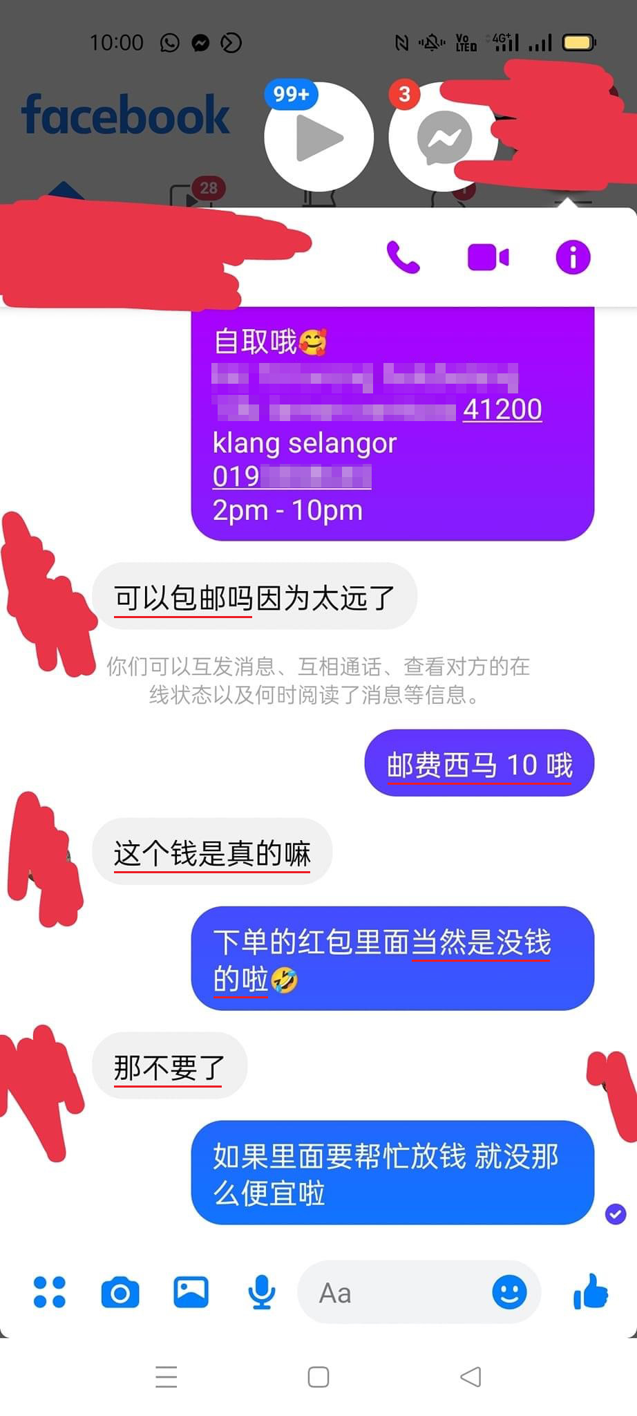 ▼ 顾客通过 Messenger 联系卖家询问,一开始卖家亲切地回复下单后顾客需要自行去取货 ,卖家就问:「可以包邮吗?因为太远了。」卖家回复西马半岛内的运费是RM10。