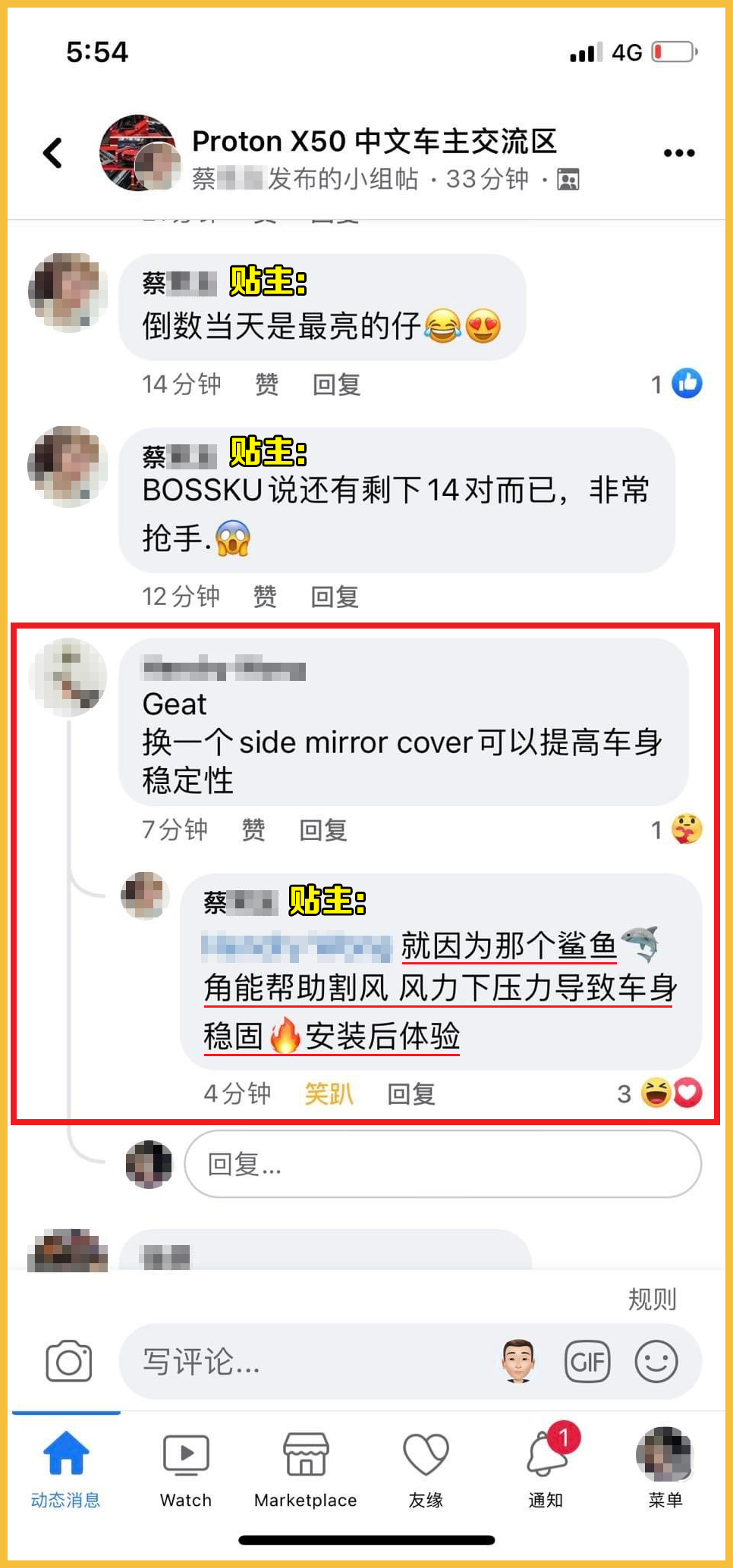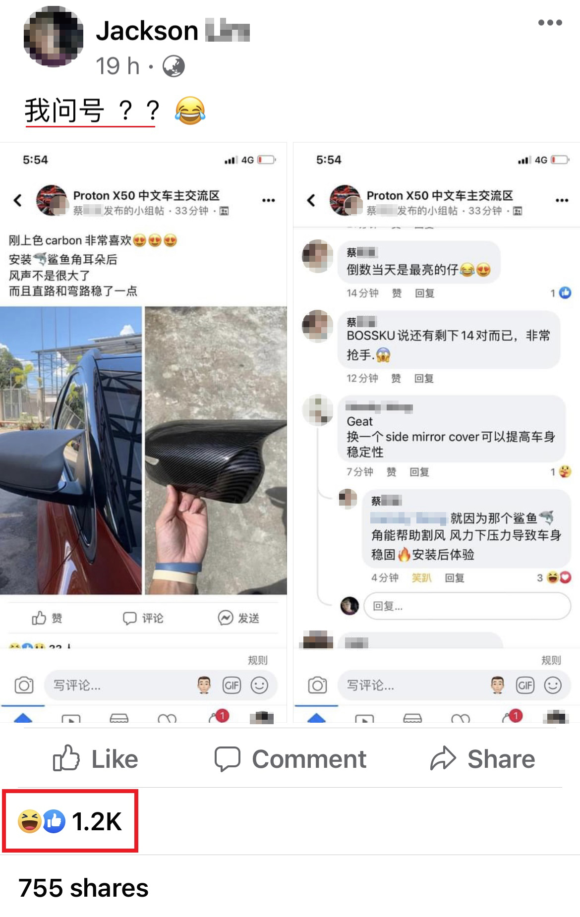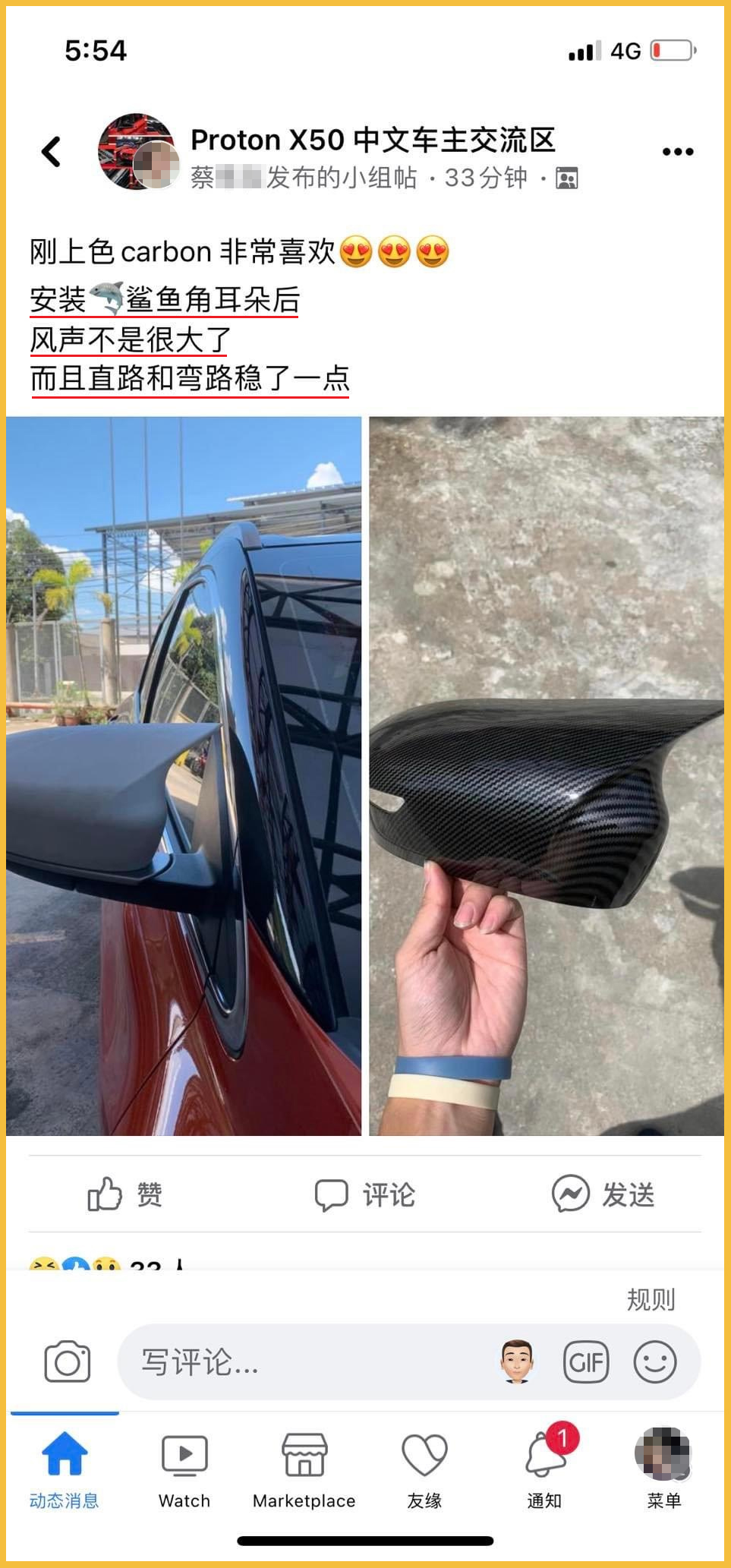 脸书群组“改装无罪(v)”近日有网友分享来自另一个群组的帖子截图,改装 Proton X50 的侧视镜变成“鲨鱼角”竟然就能有助于挡风?!