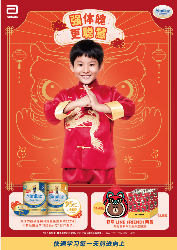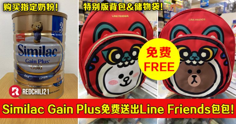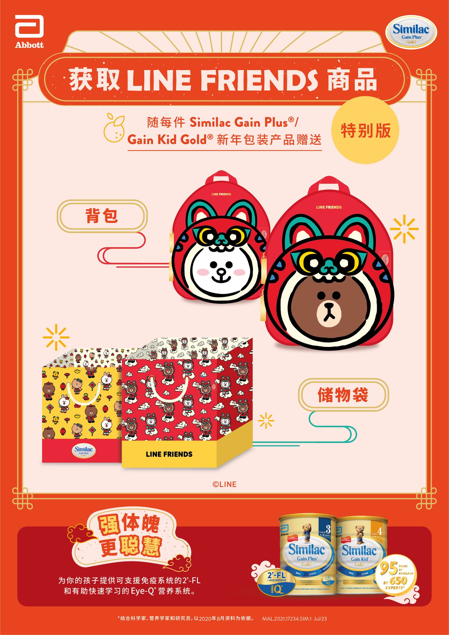 好消息来啦~如今Similac Gain Plus Gold 与LINE Friends 合作联手推出全新特别版的背包和收纳袋,只要在促销期间购买农历新年包装的Similac® Gain Plus® Gold 或Similac® Gain Kid® Gold 配方奶粉,Similac Gain Plus Gold 就免费送出LINE Friends 系列的精美背包和收纳袋!