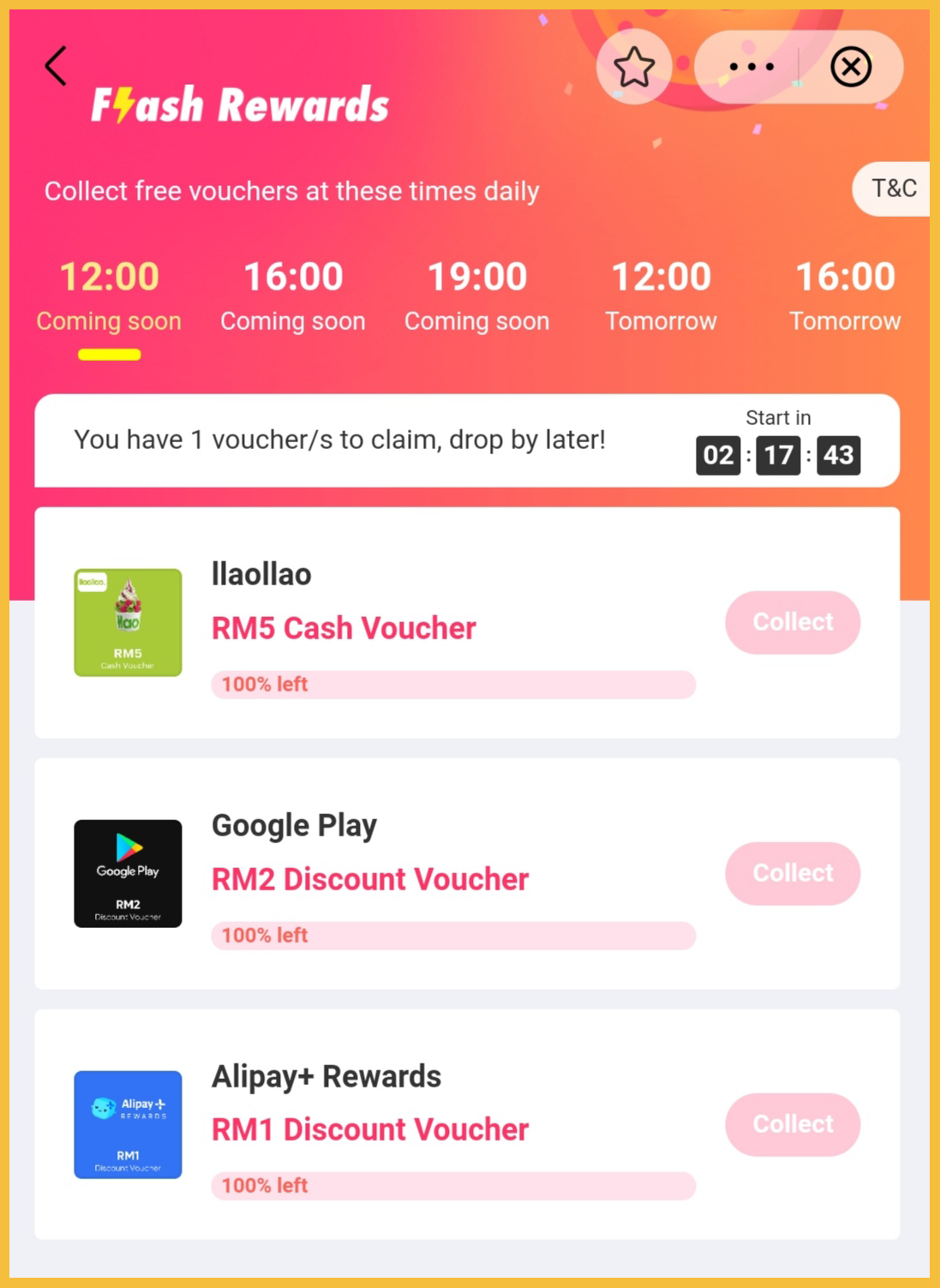 ▼ 以下是Touch’N Go 电子钱包推出3张现金礼券,以及送出的礼券数量!先领先得!(每日3个时段推出)