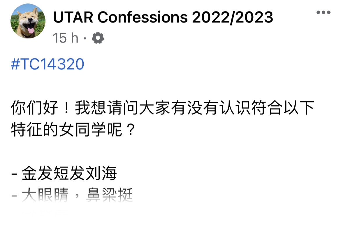 来来来,大家帮帮忙!这名 UTAR 男大生对一个女孩一见钟情,后悔当时候没有上前搭讪,所以现在通过PO文用一张他的画图,请广大网民帮忙搜!