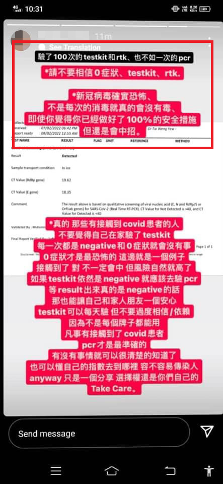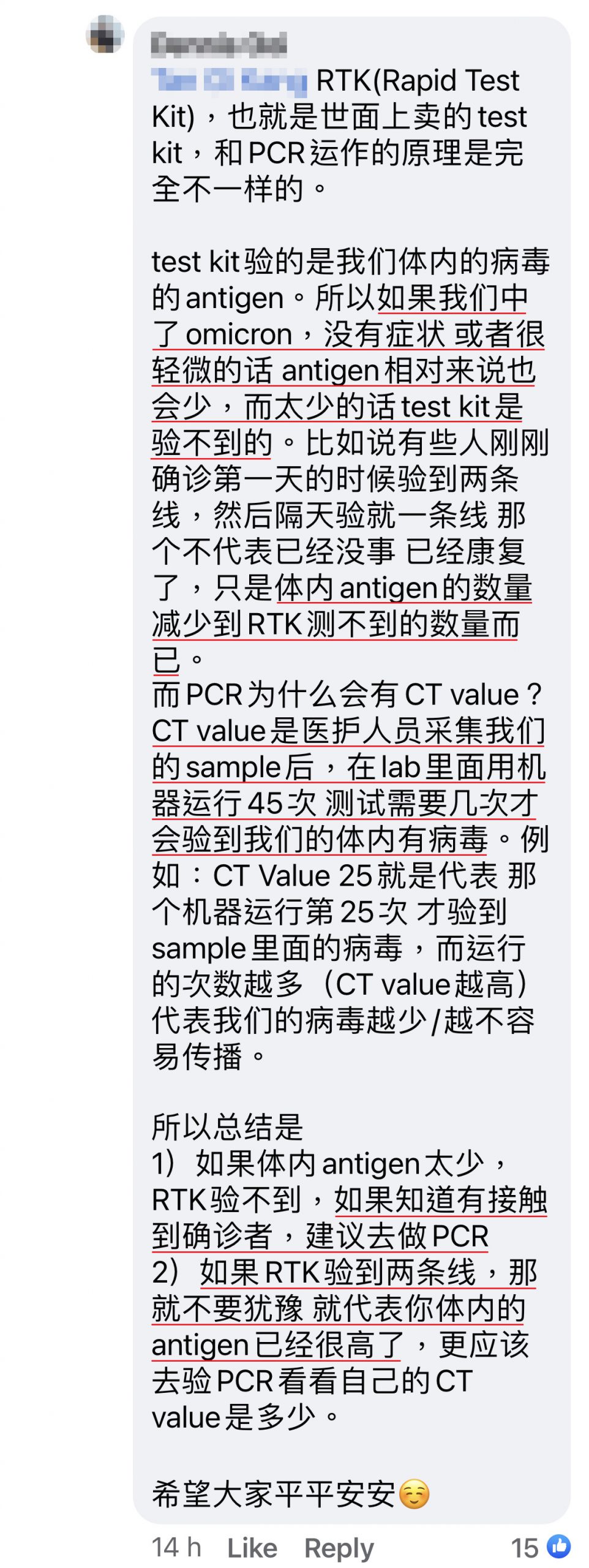 很多人以为验了 test kit 一条线没事就是没事,接着继续到处去…… 如果知道自己有几率染上的话,为了老人为了孩子,请你去做 PCR 求个安心。