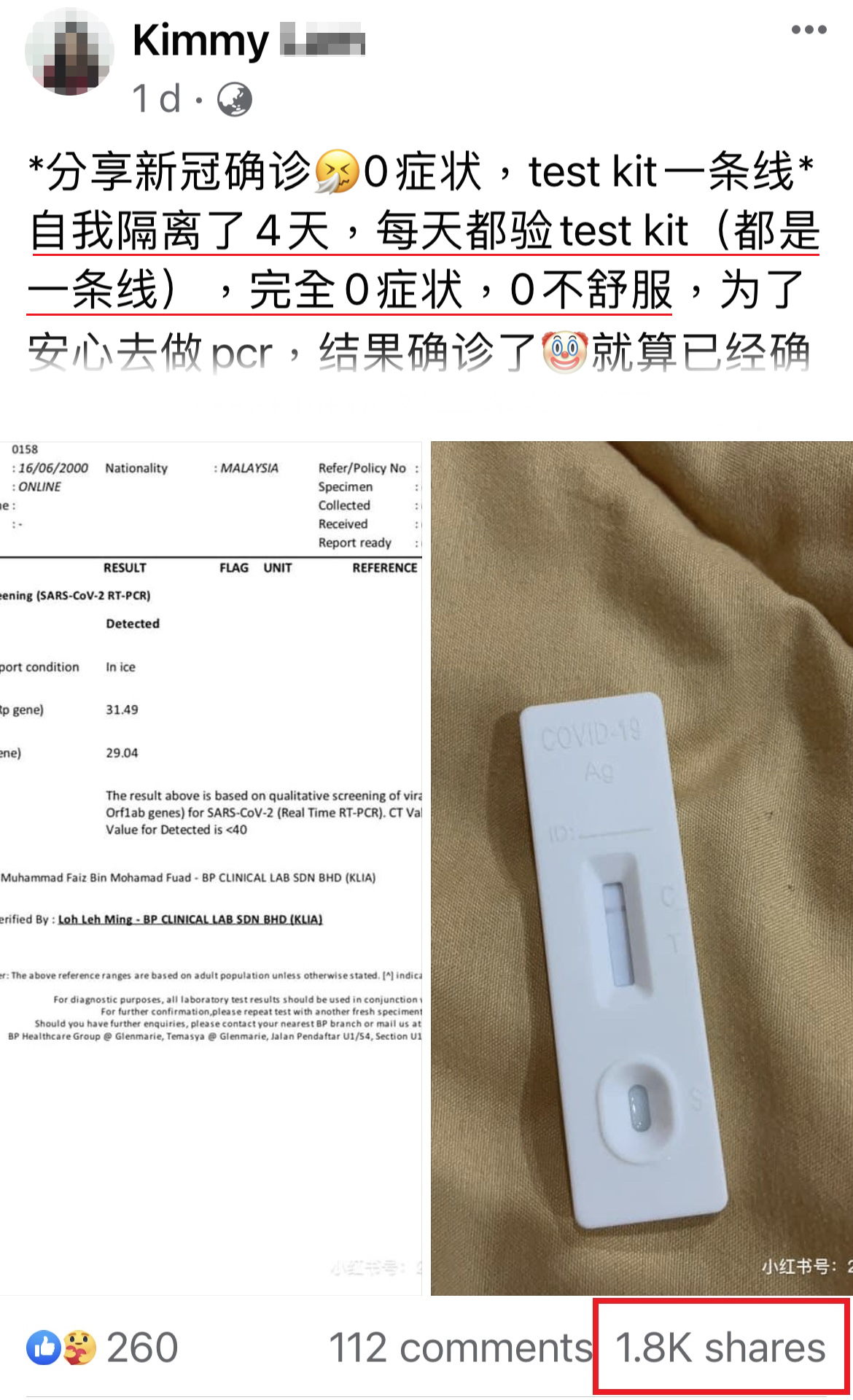 贴主 Kimmy 表示自己用过市面上各式各样不同品牌的 Test kit 做检测,身体也完全没有出现任何新冠肺炎的症状,然而当她去做 PCR 检测的时候才得知原来自己已经确诊了!