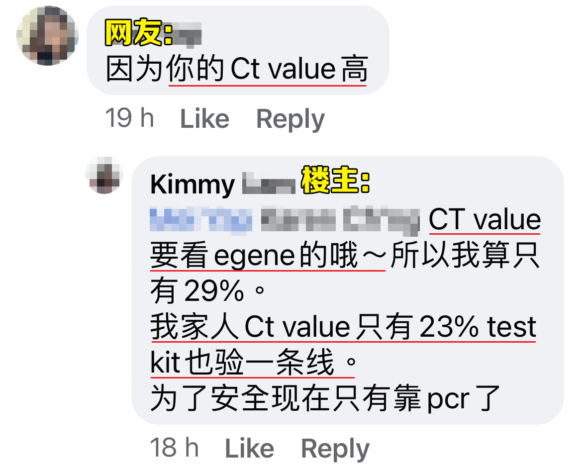 有些网友会一直觉得30多 CT value 所以 test kit 才验不到。也有人跟我说 CT value 20以下肯定两条线,但我朋友这里就有一个例子,CT value 少过20%同样一条线。