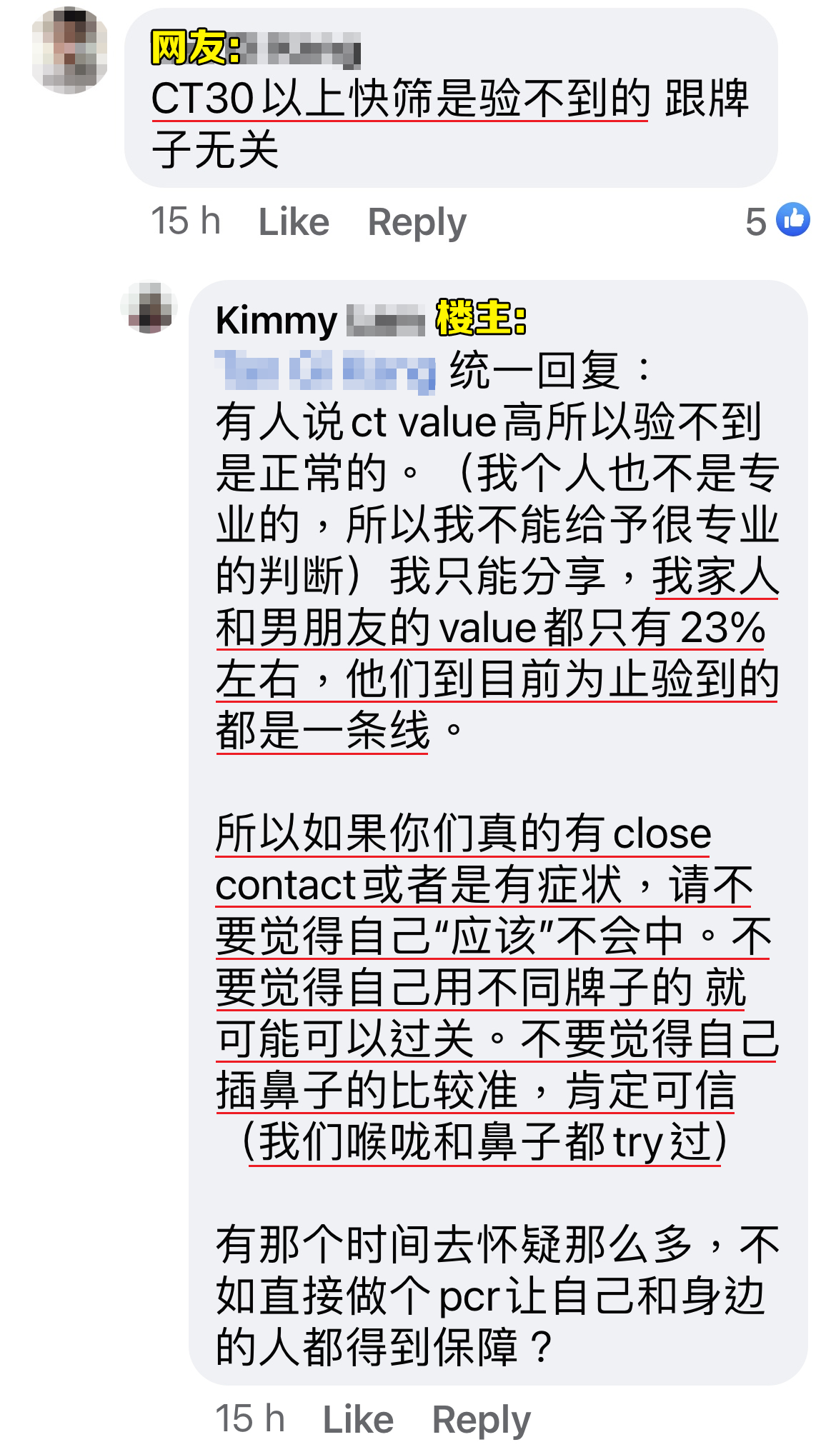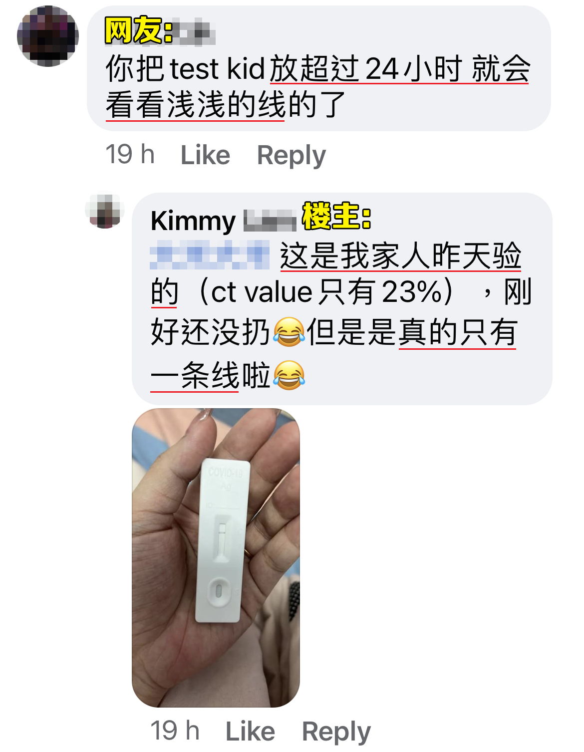 太多人跟我说 CT value 30多没有传染力(那我可以去你家拜年吗?)test kit已经验不到了,但我想告诉你们我男朋友的 CT value 只有23%到今天为止,同样也是一条线。我弟 positive 发烧第一天验两条线,第二天同样发着烧也只剩下一条线。我觉得你们要 get 对重点,重点不是 test kit 的牌子,也不是插鼻子插喉咙。