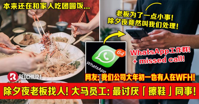 大马一名打工人近日匿名PO文抱怨,除夕夜当天和家人吃团圆饭,老板竟然还在公司的 WhatsApp 群组交代工作?!