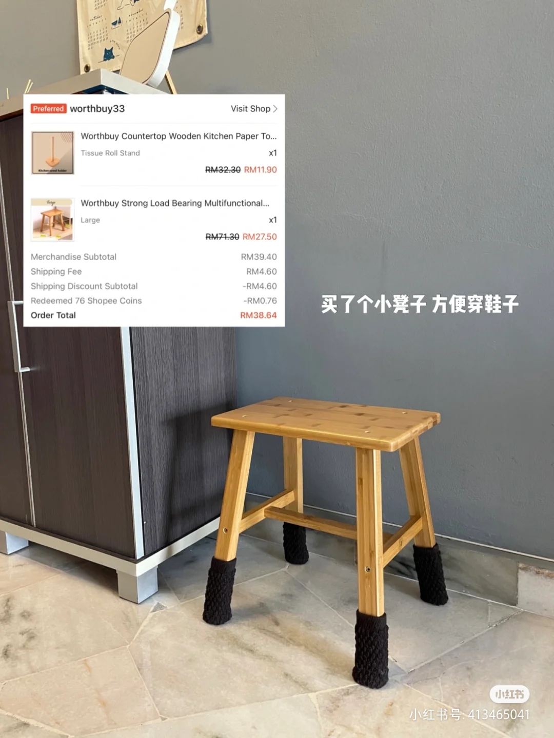 买了个小凳子放在鞋柜旁,穿鞋时就不需要蹲上蹲下啦~