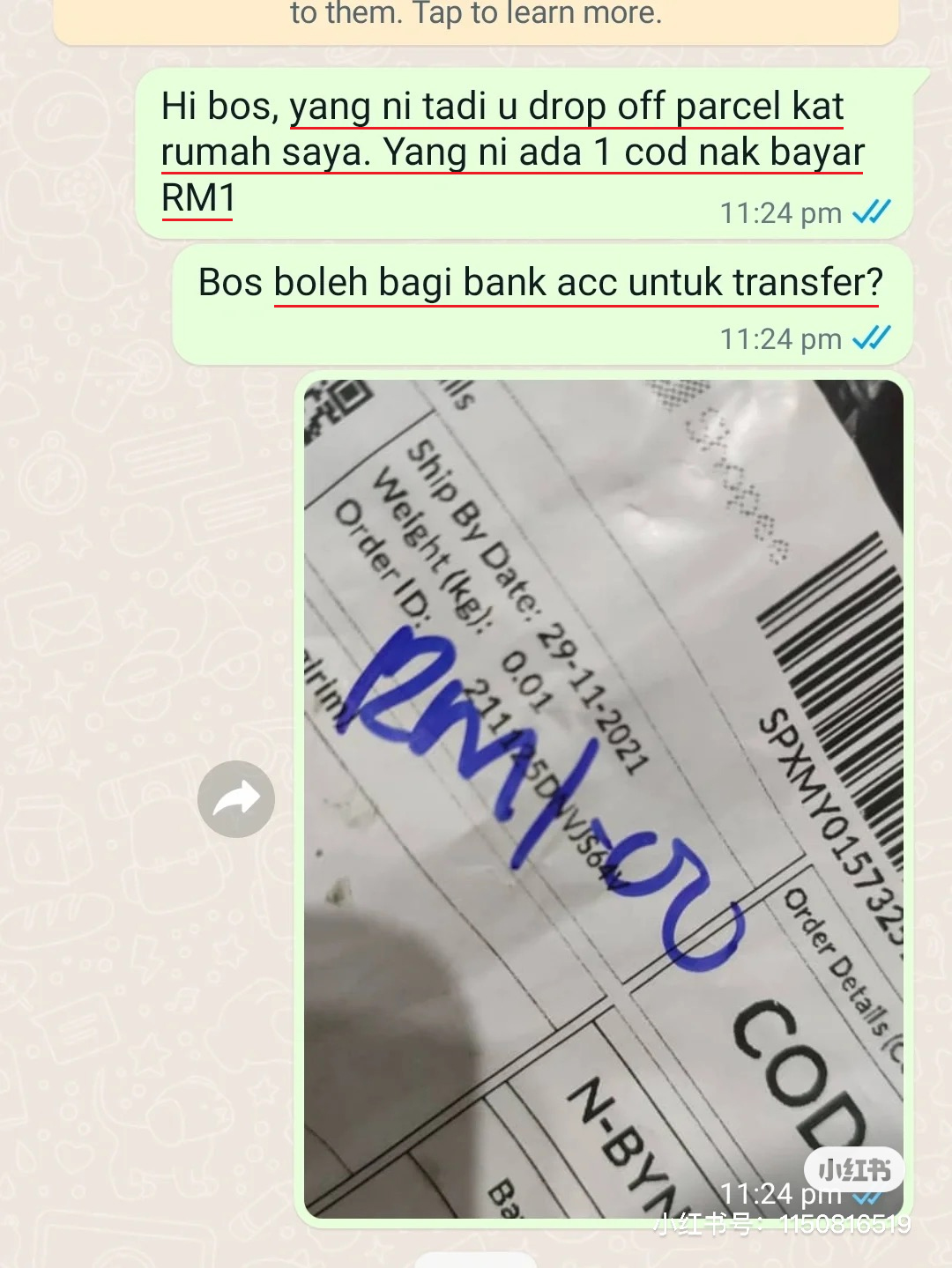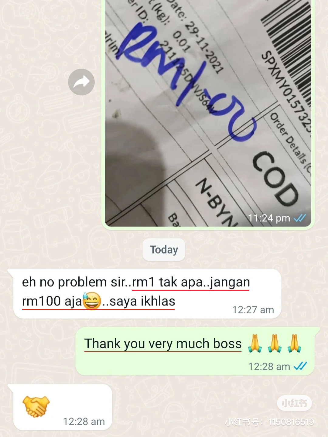晚上回到家,发现到这个是 COD 要付费RM1,心里过意不去就马上 WhatsApp 了他,结果他也很真诚的回复了说这个是他的心意。虽然RM1不是很多,但是这个社会还是很温暖的。