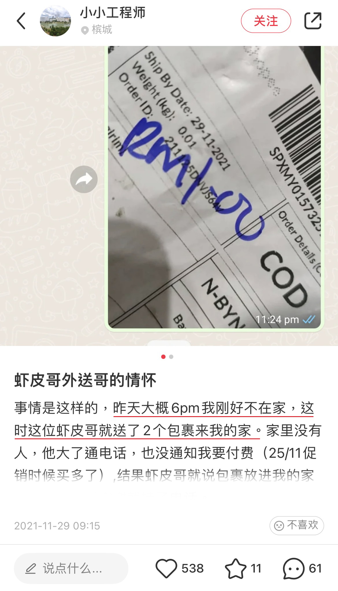 而这名大马网友就因为 COD 快递,遇到了一位超有爱的快递Abang,让他超感动直呼:原来这个社会还是很温暖的!