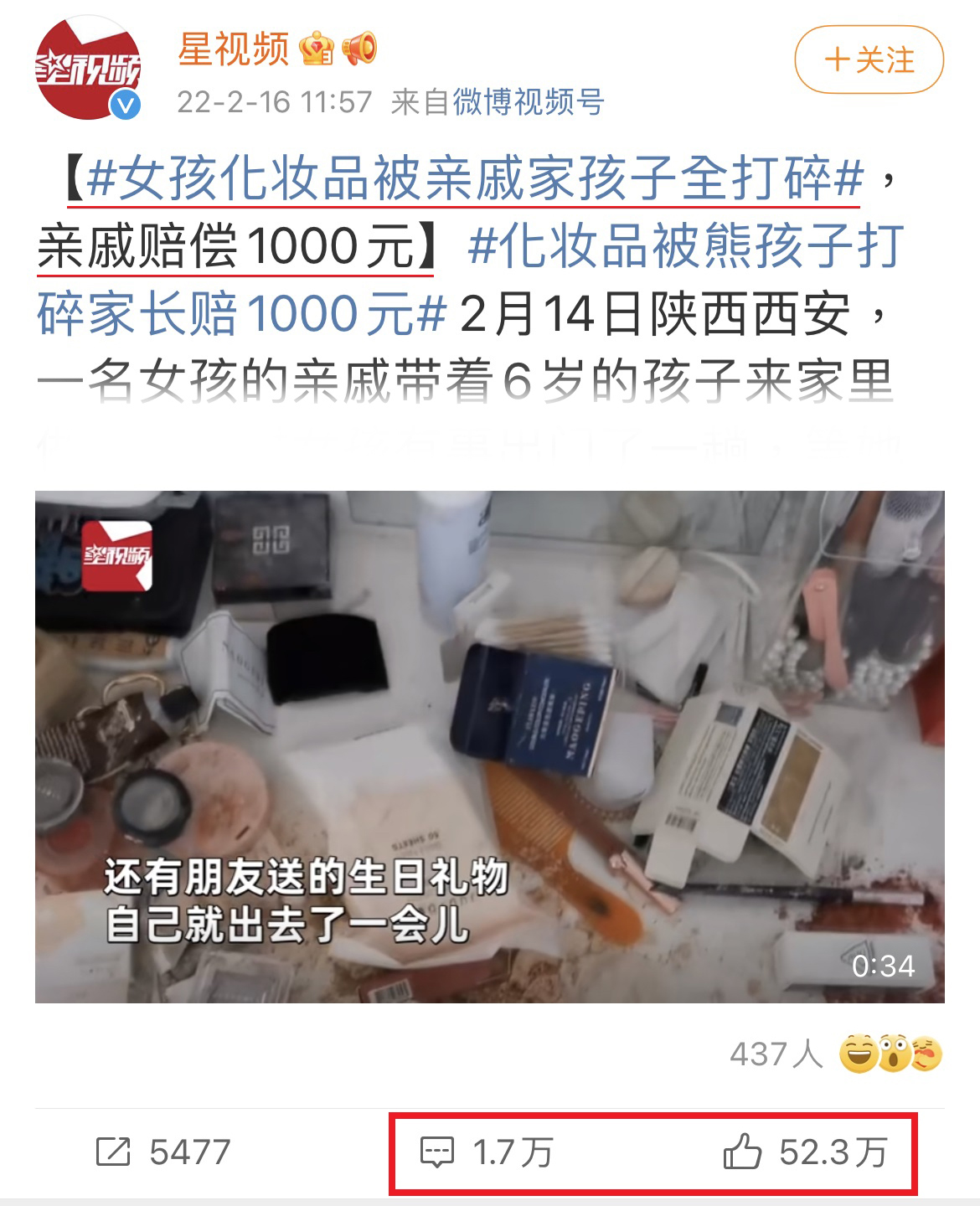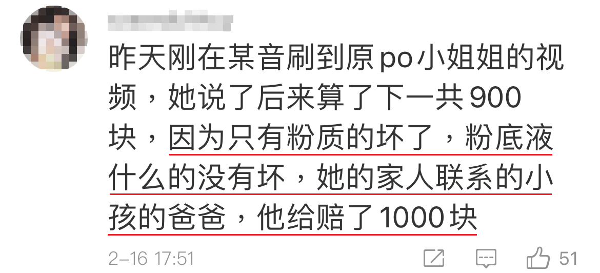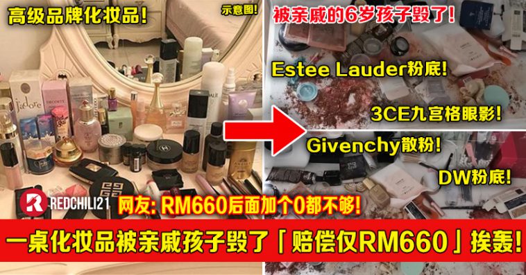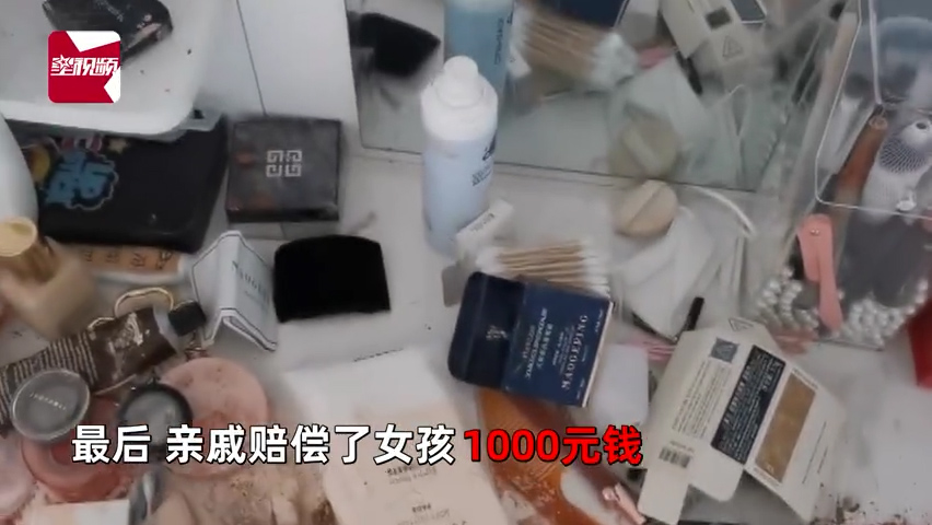 女孩看到以后崩溃大哭,表示化妆品是用她辛苦赚来的钱买的,其中一些则是朋友送的生日礼物。女孩的爸爸得知情况后打电话给亲戚,亲戚虽然赔偿了女孩1000元人民币(约 RM660)。