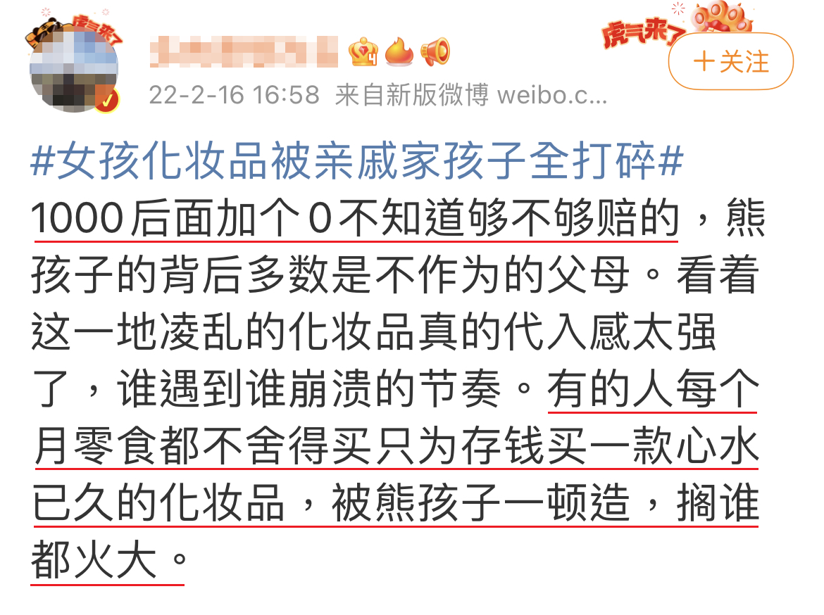 近日一则新闻登上微博热搜,中国陕西西安一名年轻女子的昂贵化妆品,被前来家里拜访的亲戚孩子打碎,发现的时候整桌的妆化品已经变成“灾难现场”,女子崩溃爆哭!
