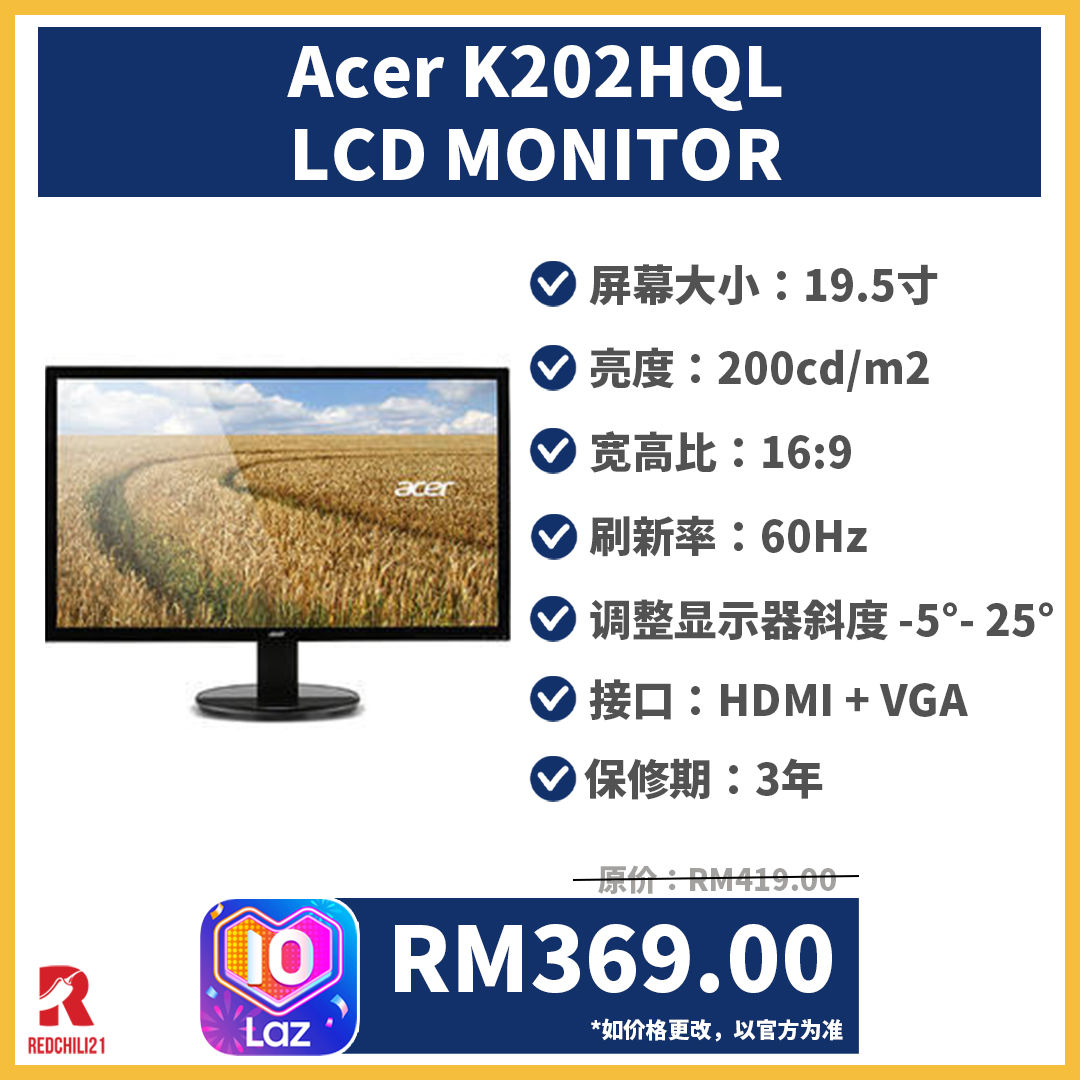 ▼ ACER 19.5” LCD MONITOR K202HQL ABIX