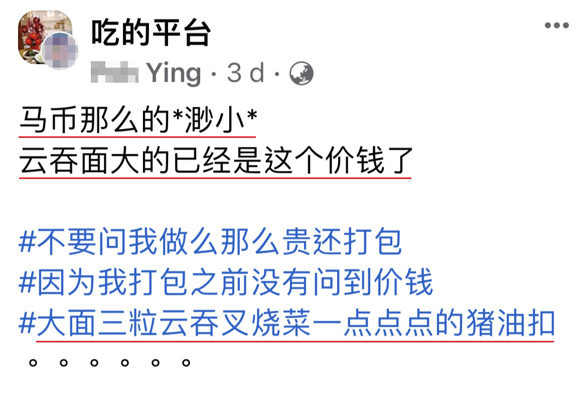 贴主在帖文里表示,他一共点了3包大的云吞面,除了云吞面的面条,配料有3粒云吞和叉烧肉、少许青菜和一点点的猪油渣,就和一般的云吞面没什么区别,然而价钱就差得远了…..