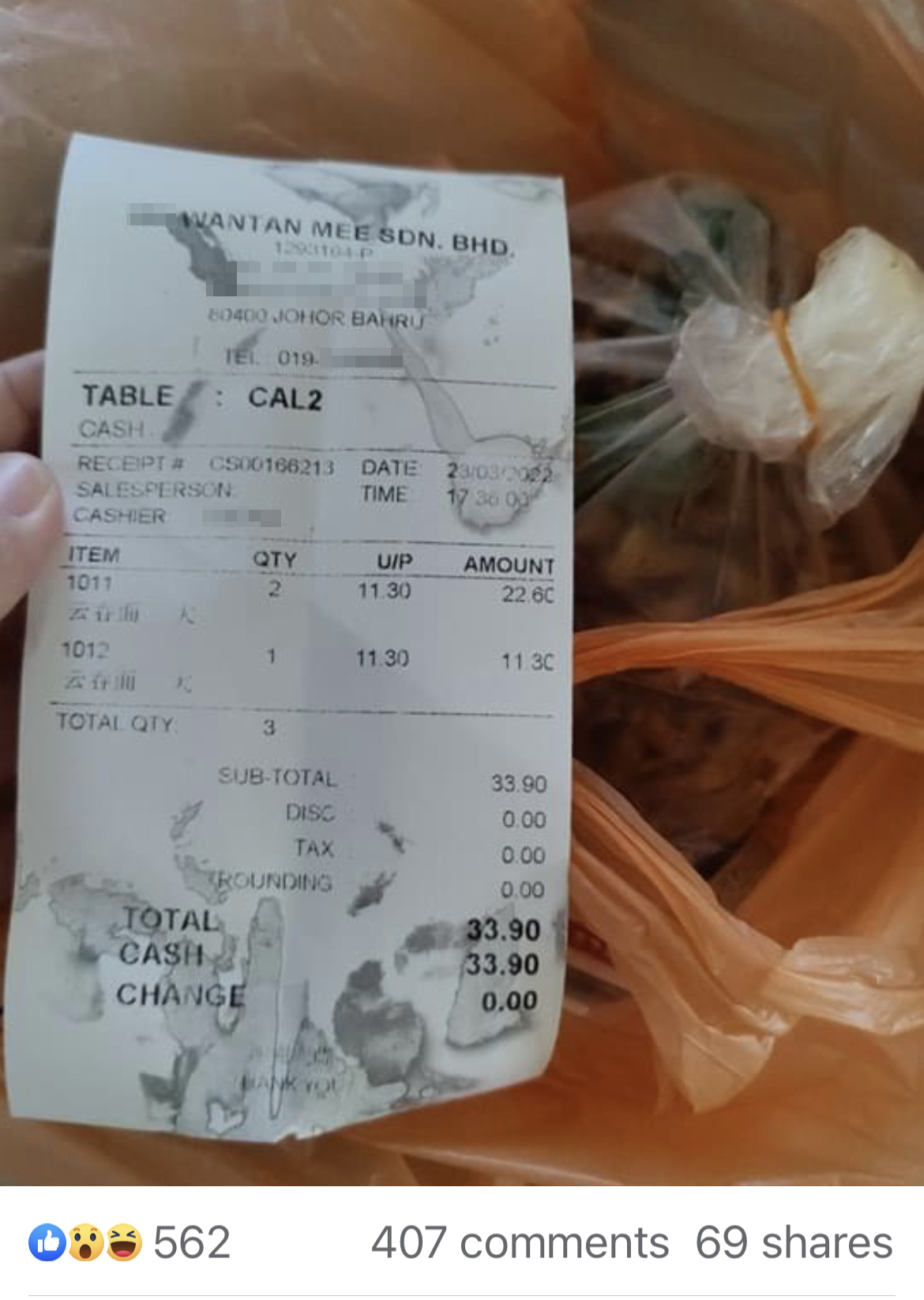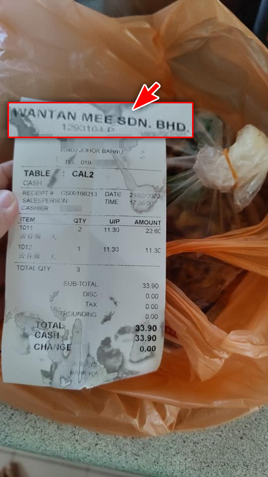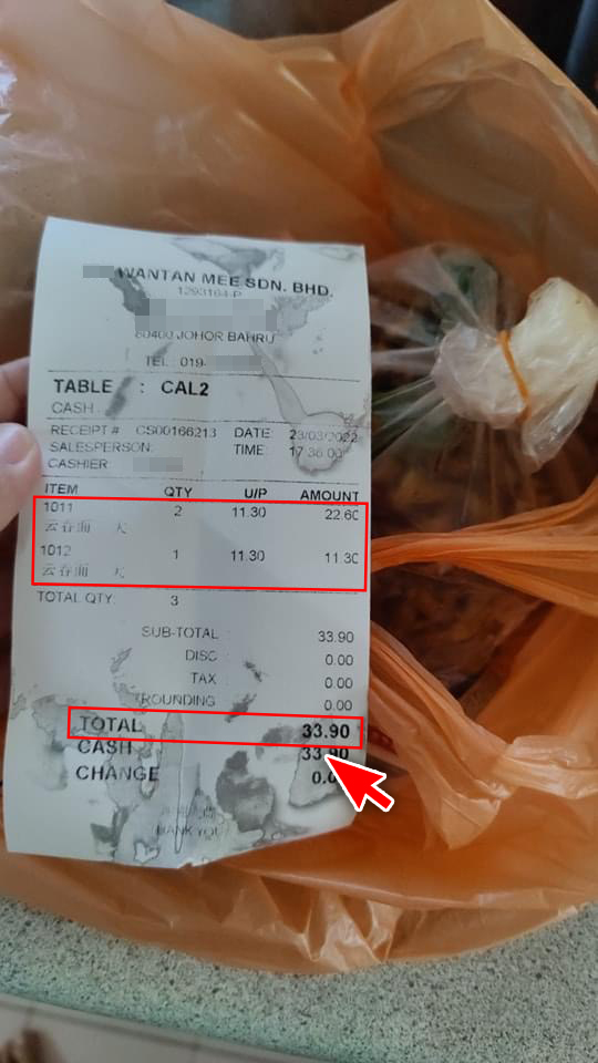 ▼ 单据上白纸黑字清清楚楚地写着,3包云吞面总共RM33.90,平均一包是RM11.30!