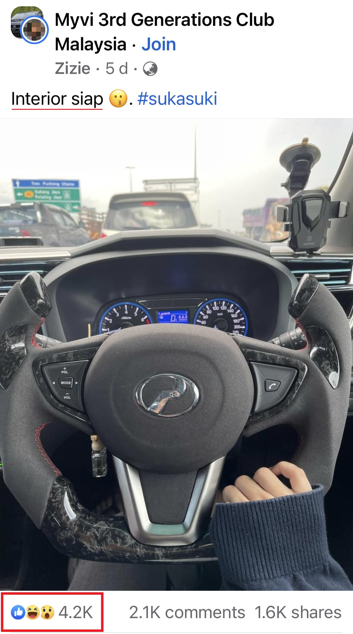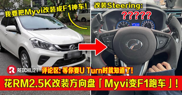 一名巫裔网友近日就在脸书群组分享自己的 Myvi 全新模样,花RM2500改装方向盘,把 F1 跑车的灵魂注入在 Myvi 的身上了!