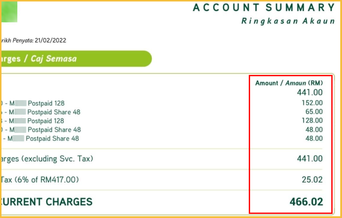 ▼ 从2月份的账单中可以看到,贴主签购的是 Postpaid 128 及 Postpaid Share 48 配套,但RM128配套却写着RM152的收费,而RM48的配套也变成了RM65。