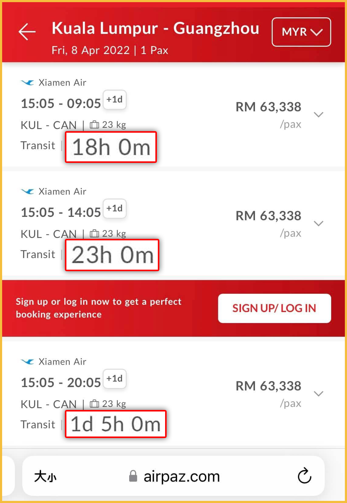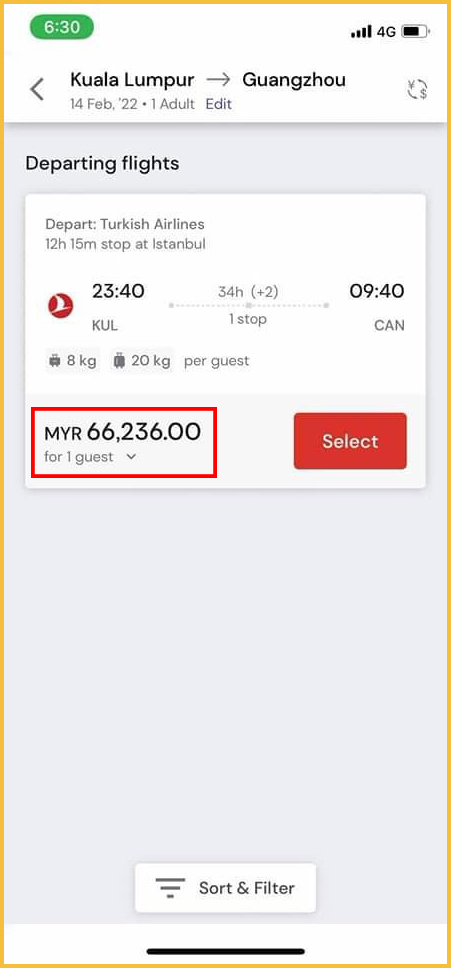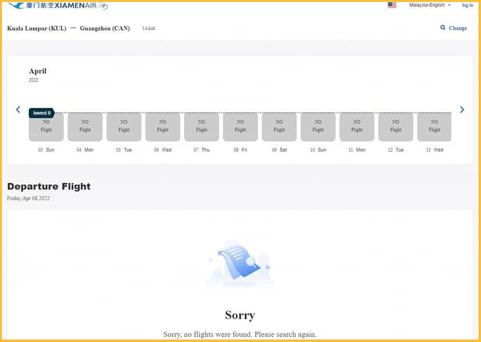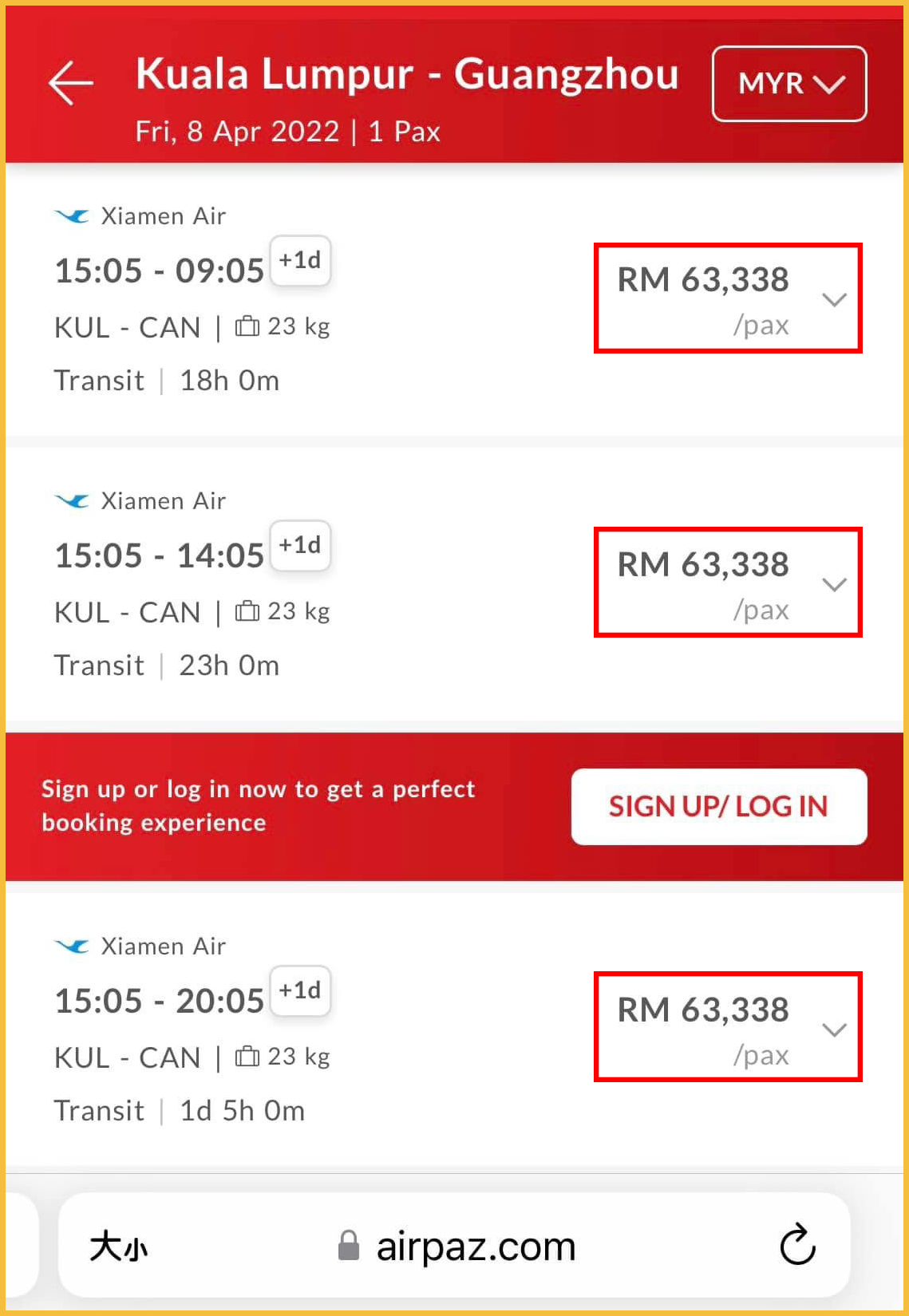 ▼ 贴主在网站上搜索4月8日从吉隆坡飞往中国广州,厦门航空公司的机票一位乘客的票价是RM63,338!是的,你没有看错!这是马币哦!
