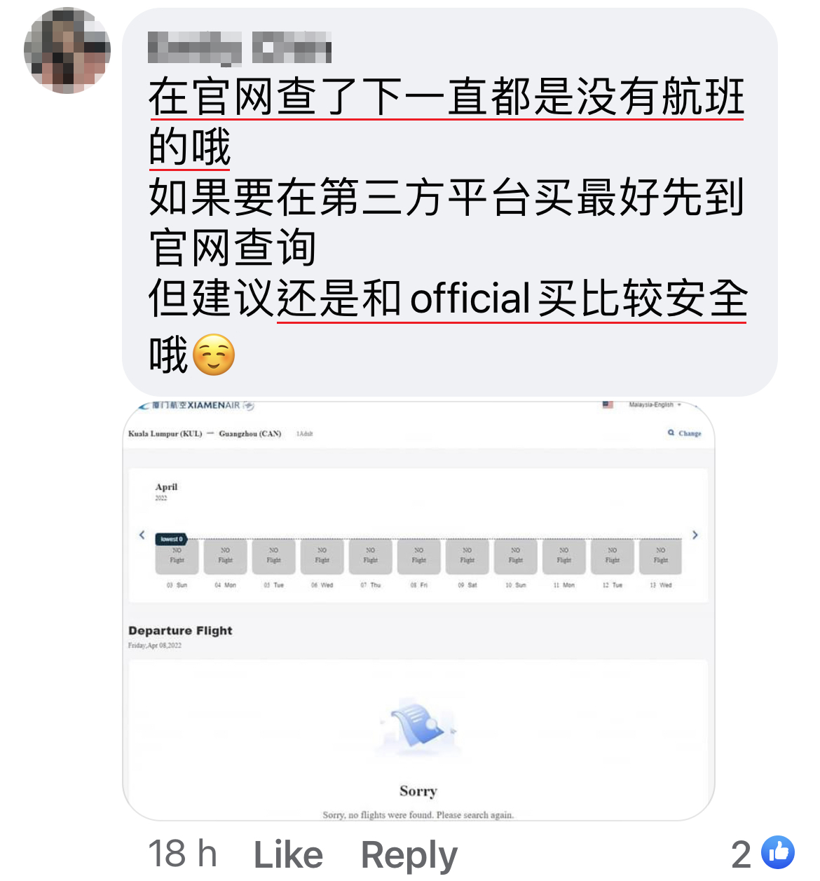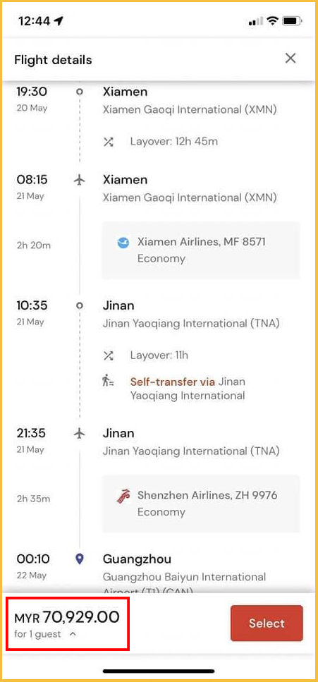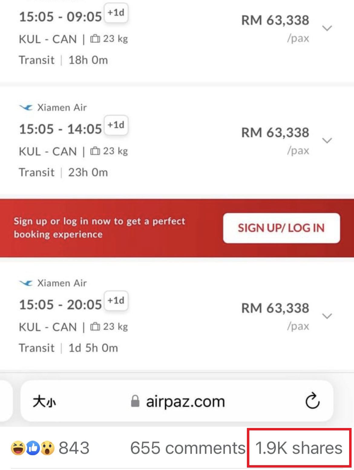 ▼ 贴主在网站上搜索4月8日从吉隆坡飞往中国广州,厦门航空公司的机票一位乘客的票价是RM63,338!是的,你没有看错!这是马币哦!
