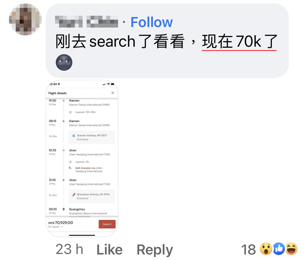 ▼ 飞往中国其它地区的航班,票价高达RM70,000!