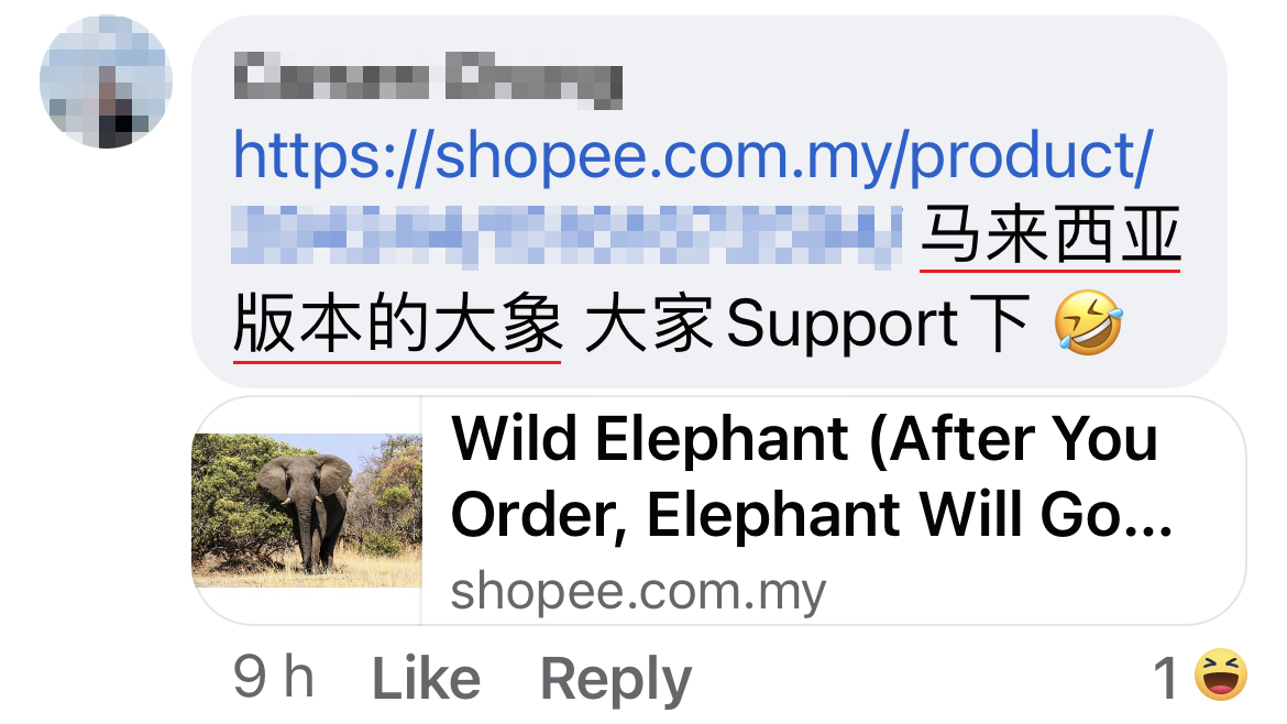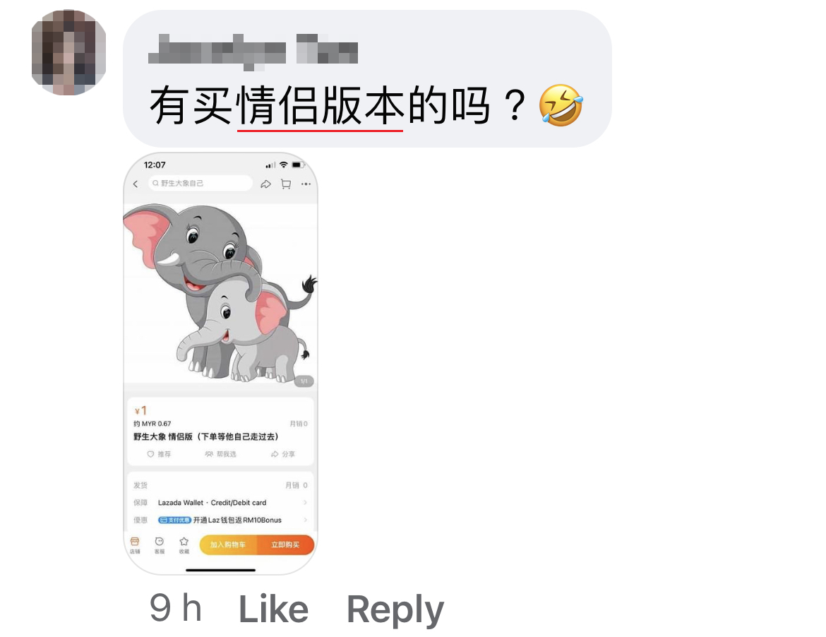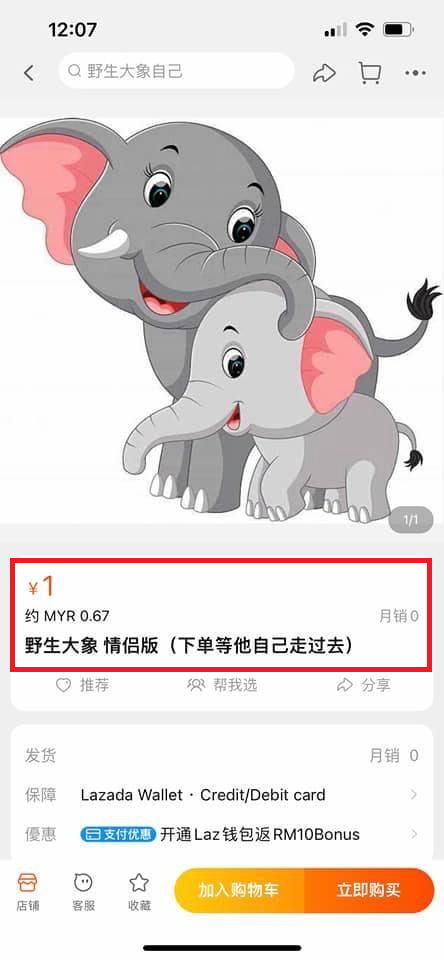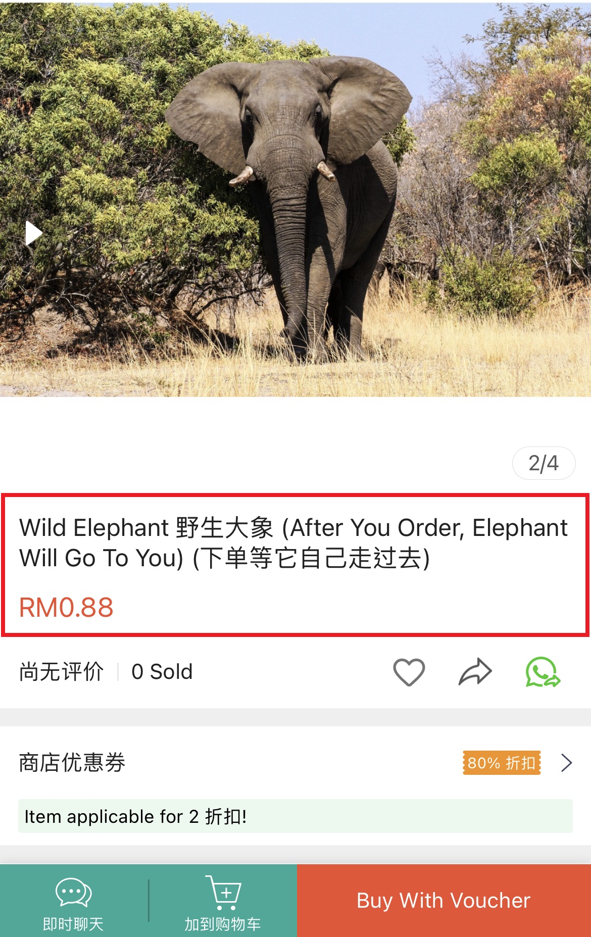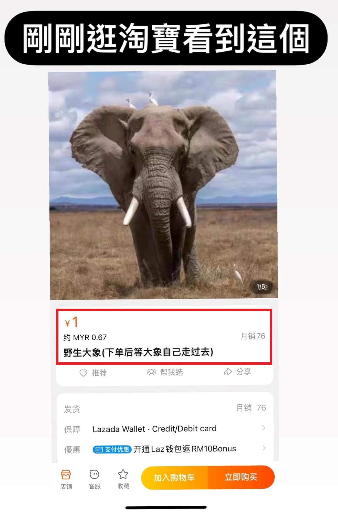 ▼ 该店铺的其中一个上架商品:一只RM0.67的大象,卖家特别注明「下单后等大象自己走过去」。