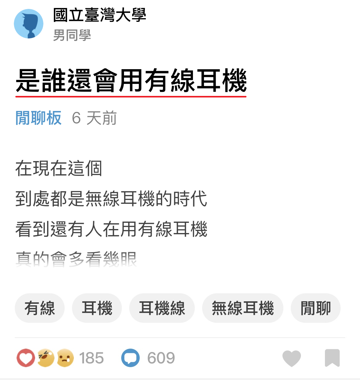 台湾一名男大生近日在 Dcard 匿名PO文,用着 AirPods Pro 的他看到路人用着有线耳机觉得很新奇,明明无线耳机这么好用为什么还有人在用有线的?