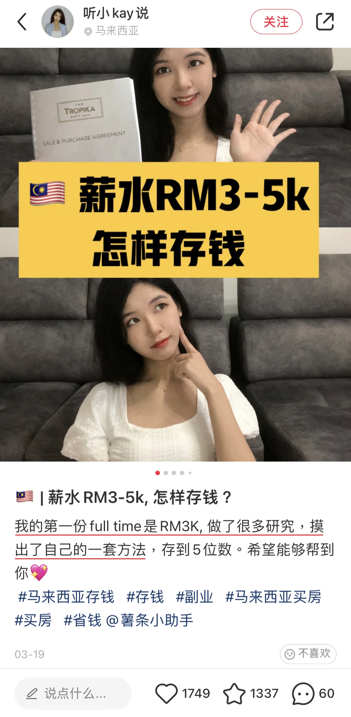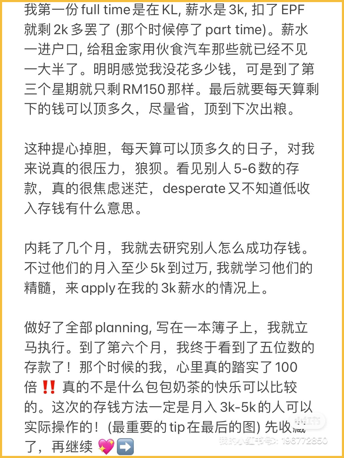 一名大马小红书博主“听小kay说”发文分享,曾经在6个月内存到5位数存款,而且当时的月薪只有RM3K哦!所以不是没有可能的!
