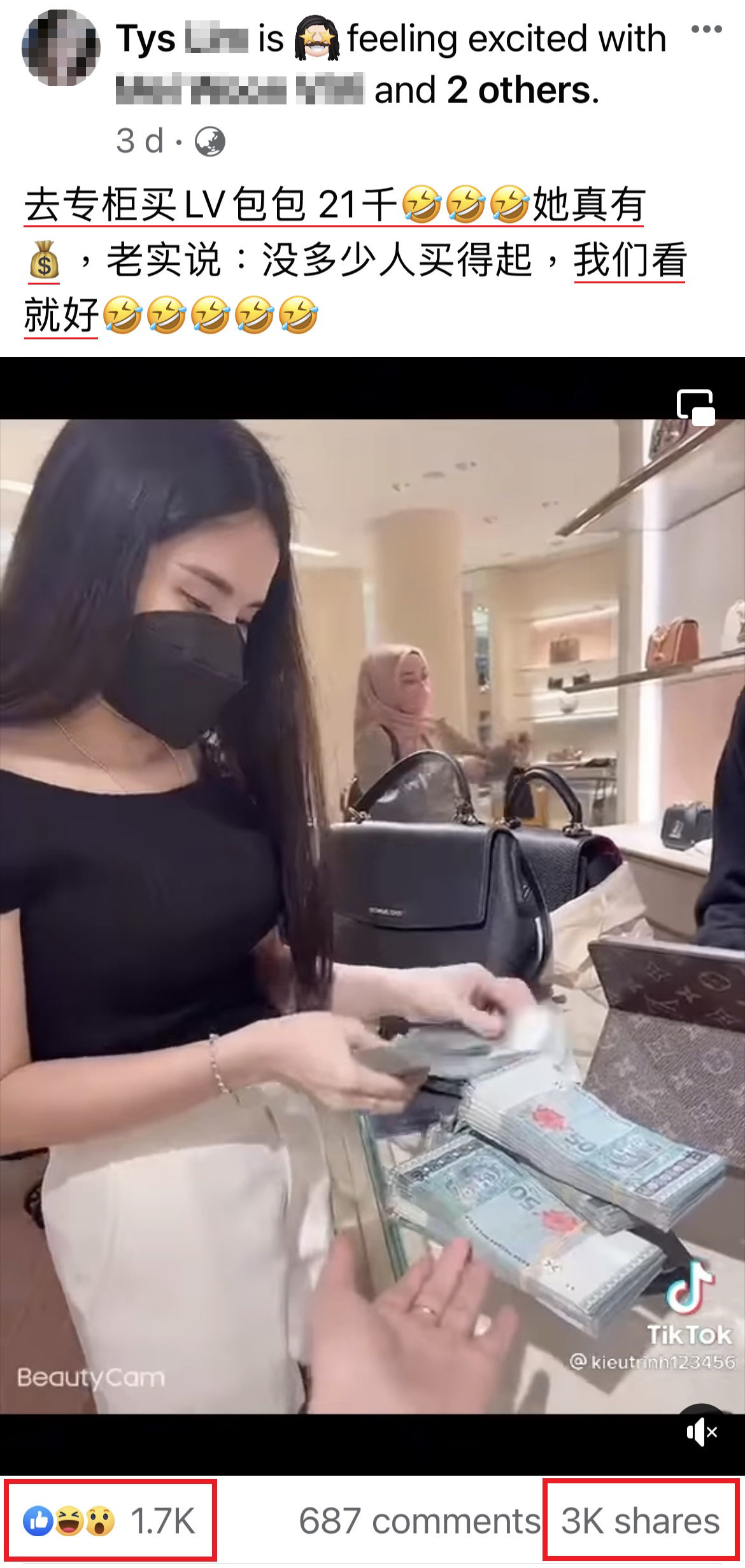 大马女子RM21K现金买LV包!闺蜜PO视频「没多少人买得起」!评论区:RM21K也不是很多而已!