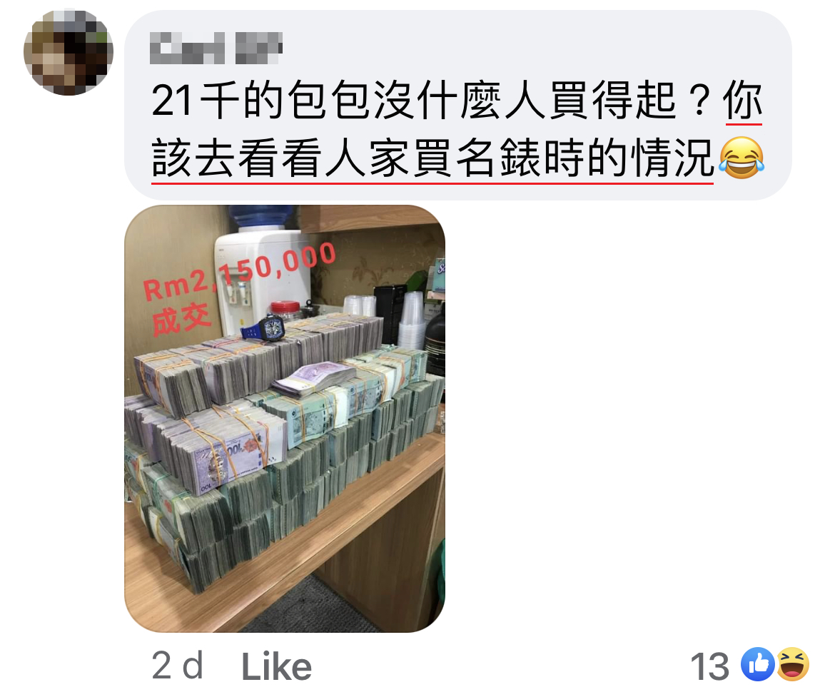 现在买比较贵的东西都是直接刷卡支付,很少人会随身带着现金去 Shopping 的,但这名大马女子就拿着一叠一叠厚厚的5位数现钞去专柜买奢侈名牌包,结果评论区的留言几乎都很“酸”…..
