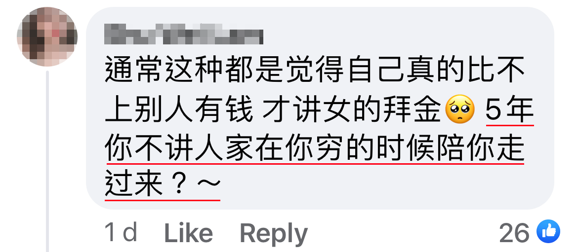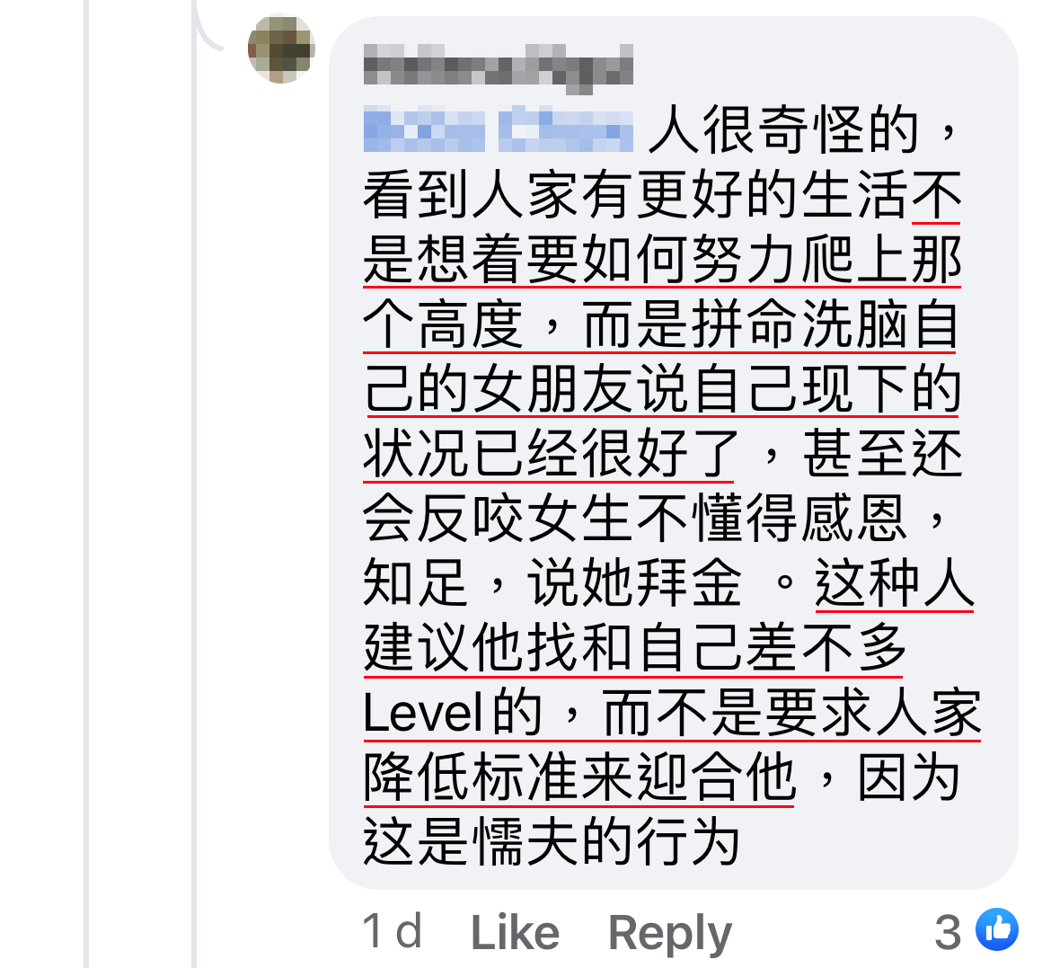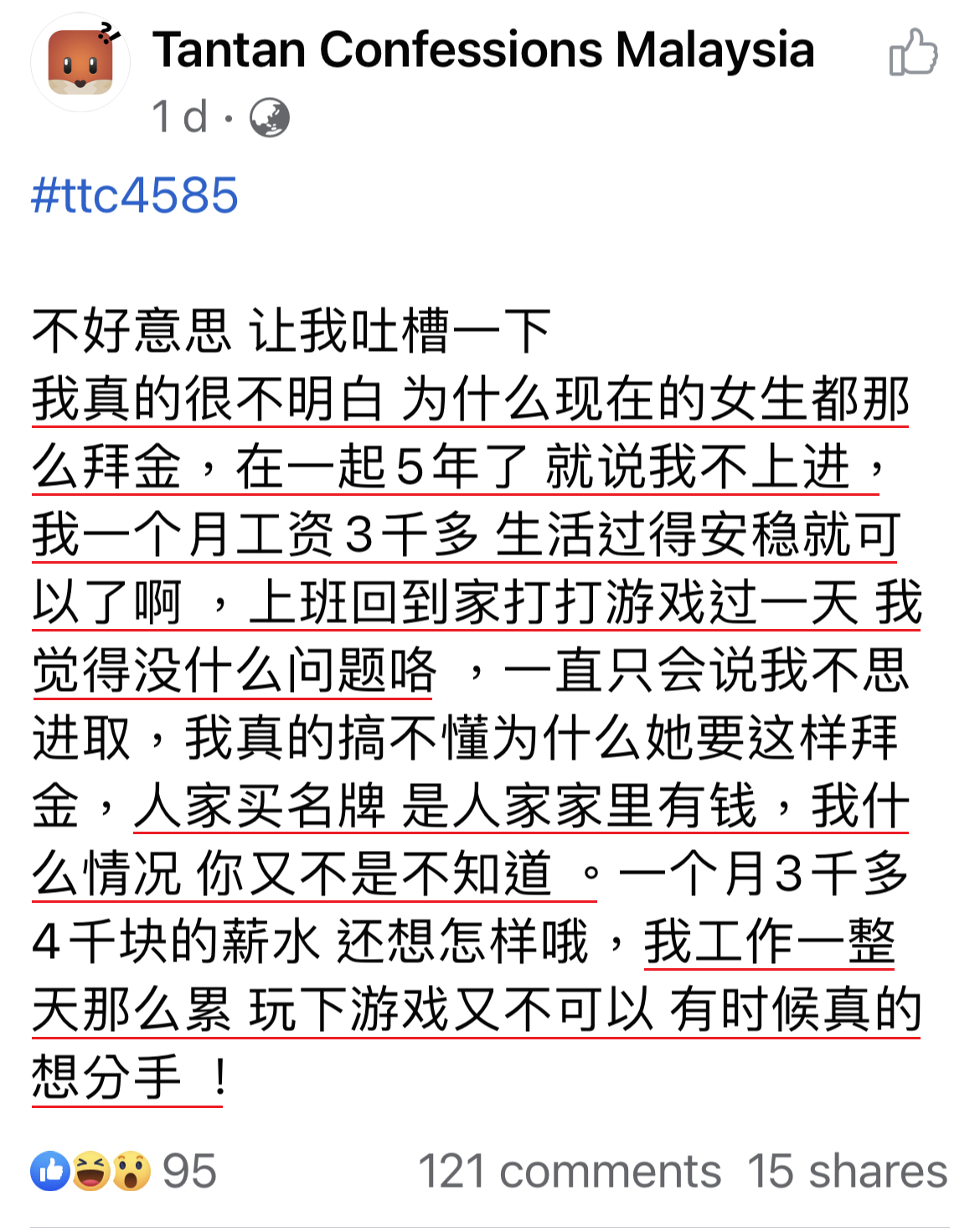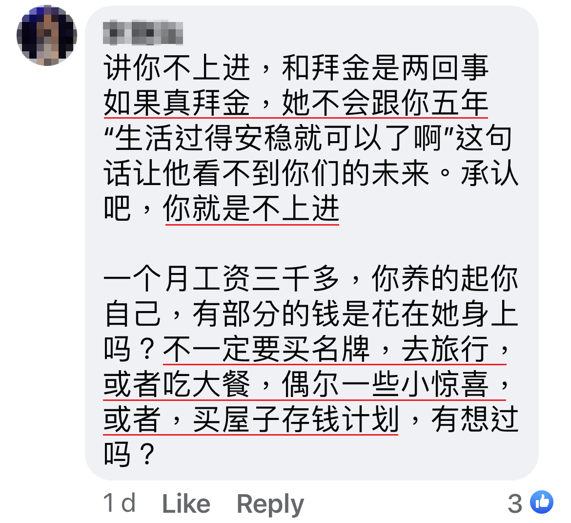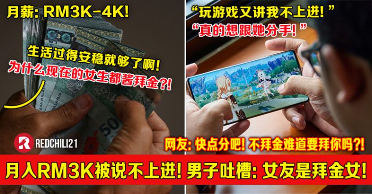 大马男子和女友交往5年,近日在脸书匿名PO文吐槽,月薪3千多的他已经满足于现状,但女友却还批评他不上进,因而称女友是拜金女!