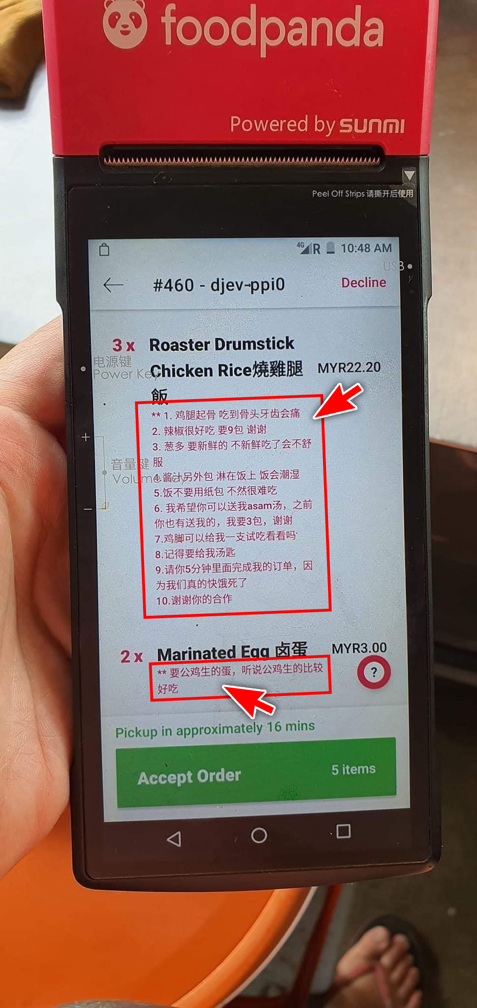 该名顾客在 Foodpanda 外卖平台点外卖,从订单上可以看到一大串的备注,烧鸡腿饭一共有10个要求,而卤蛋也有1项很重要的要求,那就是:必须是公鸡下的蛋!因为公鸡的蛋比较香?!