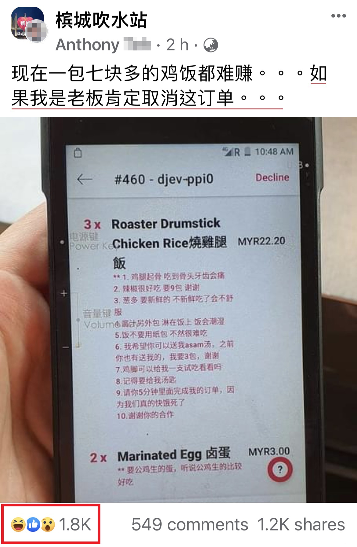 世界上什么样的奥客都有,只要是做生意的都难免会遇到… 就比如这个卖鸡饭的大马商家,某位顾客通过 App 点外卖烧鸡腿饭和卤蛋,备注的要求竟然就多达11条!