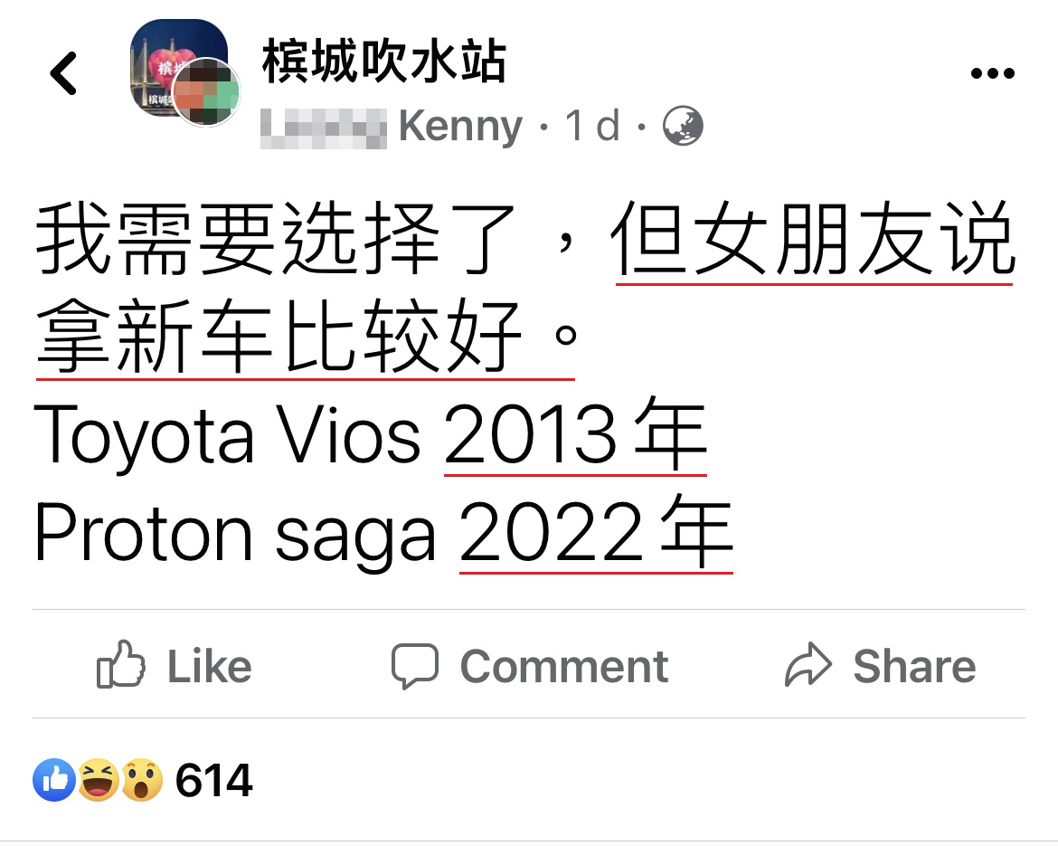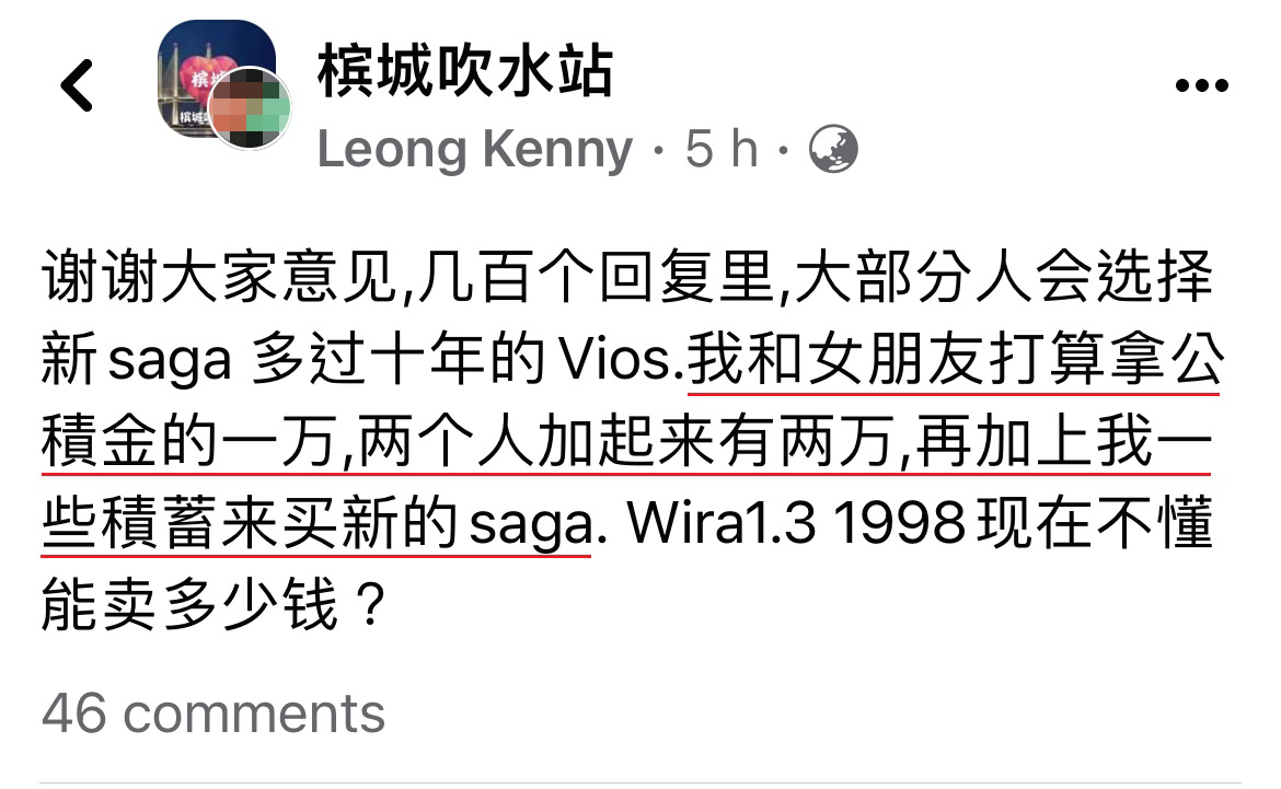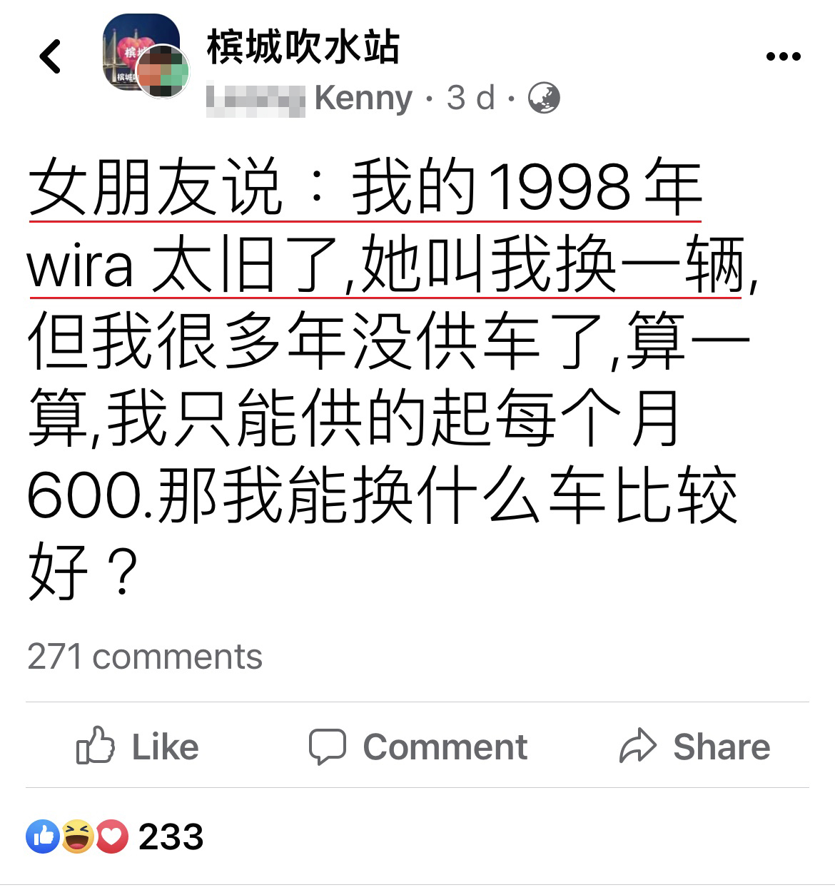 近日一名大马男子在“吹水站”询问网友们的意见,女友说他的1998年 Saga 太旧了,是时候换一辆车了,男子也认同但就是不知道该换什么车,所以想要通过PO文集思广益。