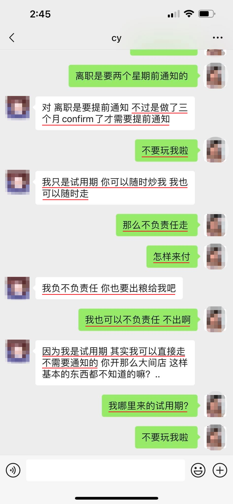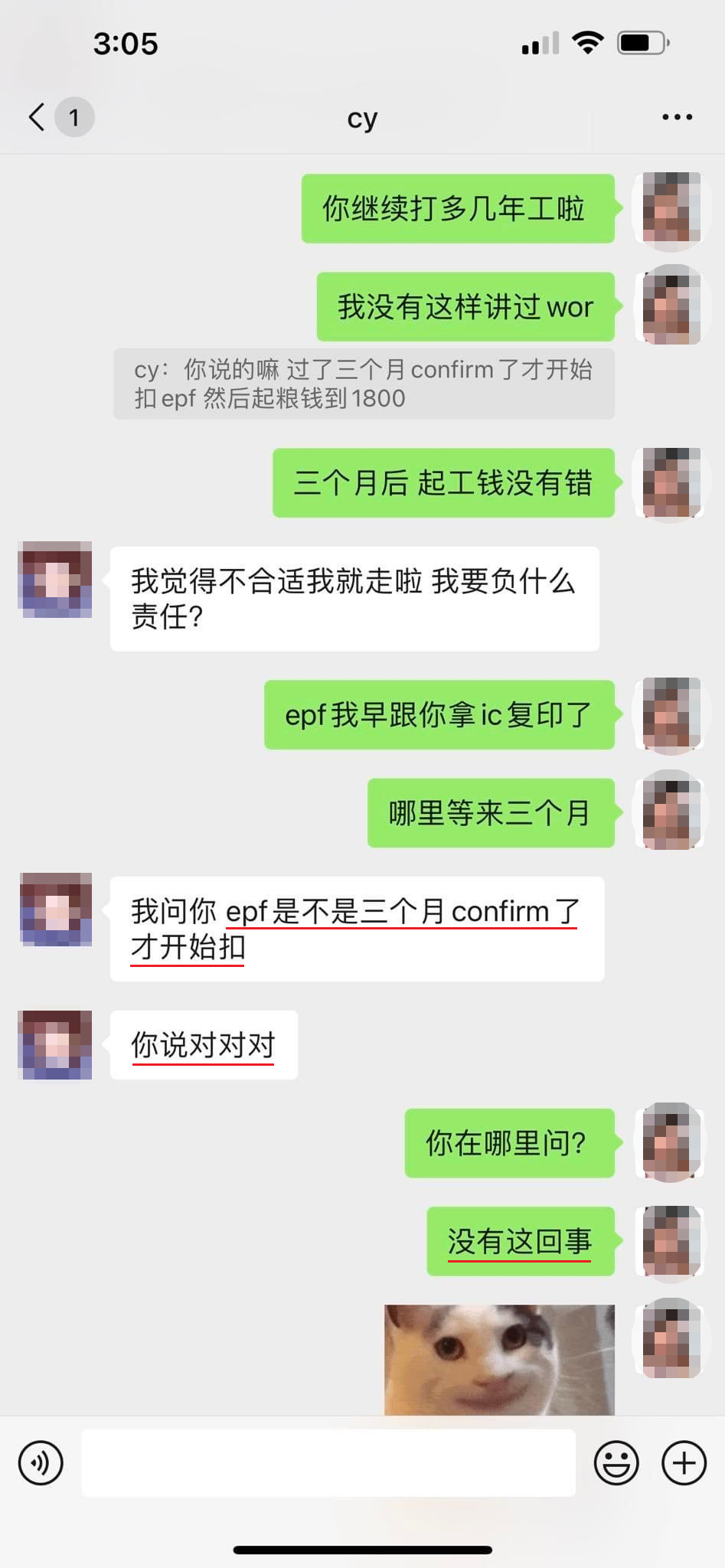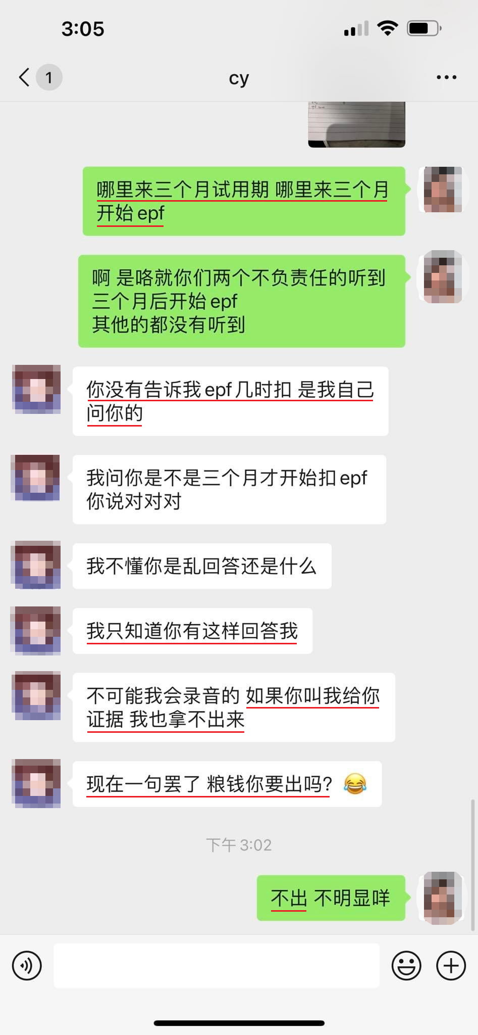 头三个月 RM1500 后三个月看表现起薪,我句句没有提过试用期。妳为什么不把所有聊天记录放出来?
