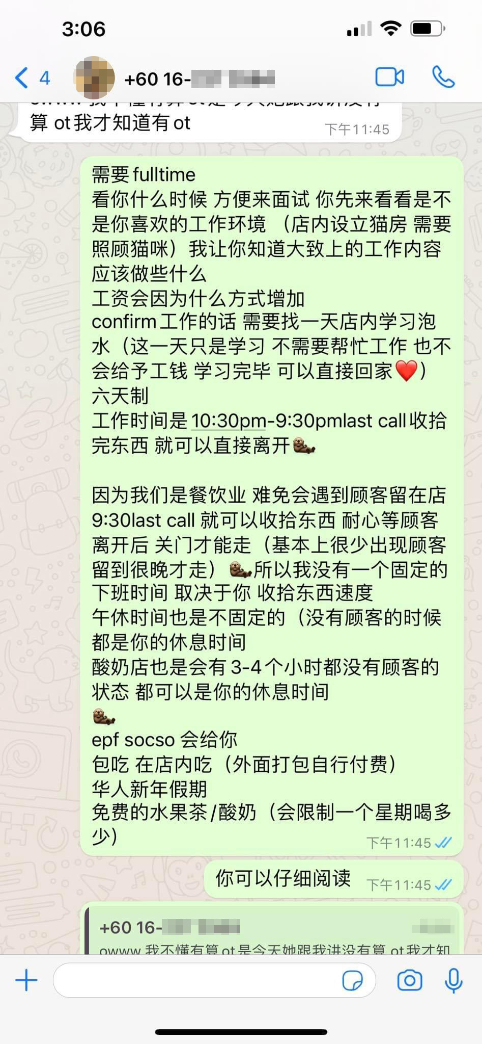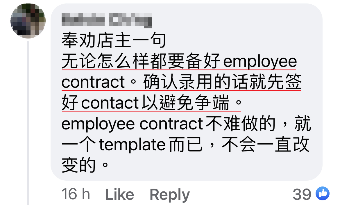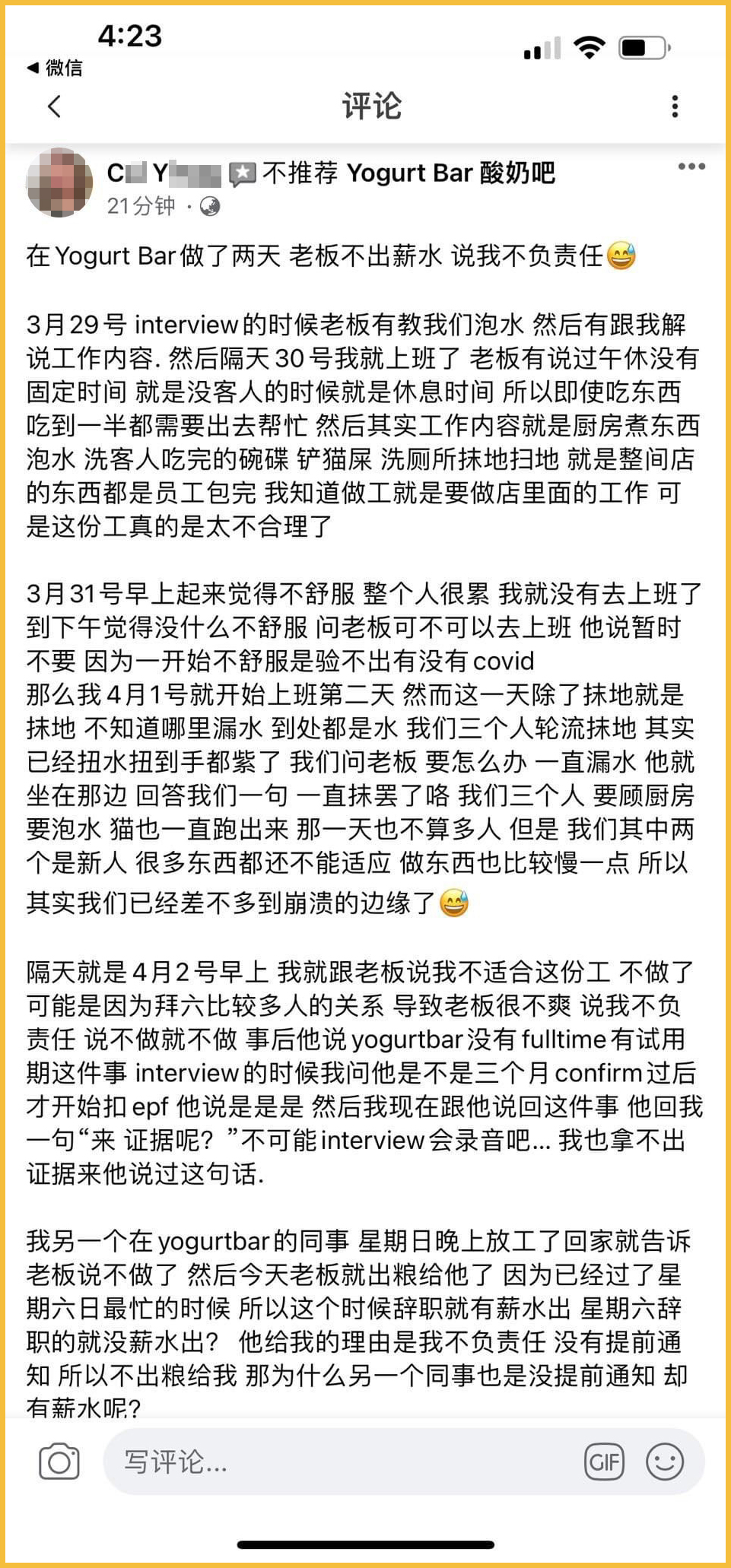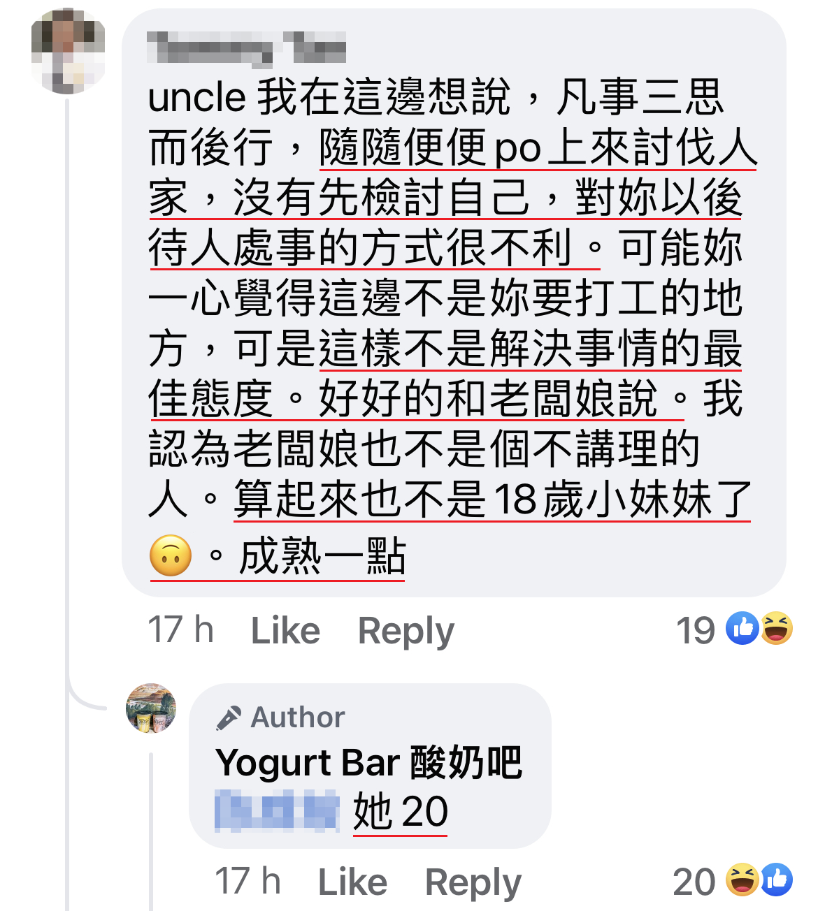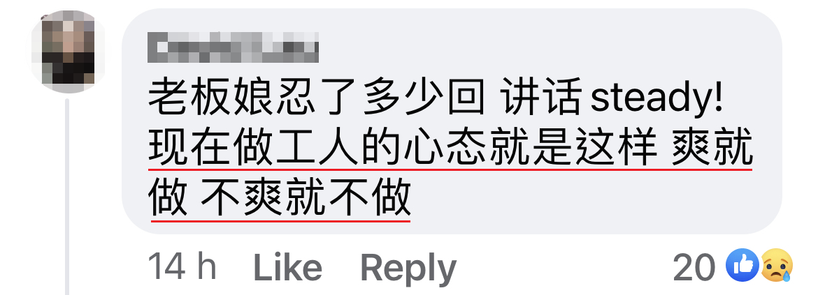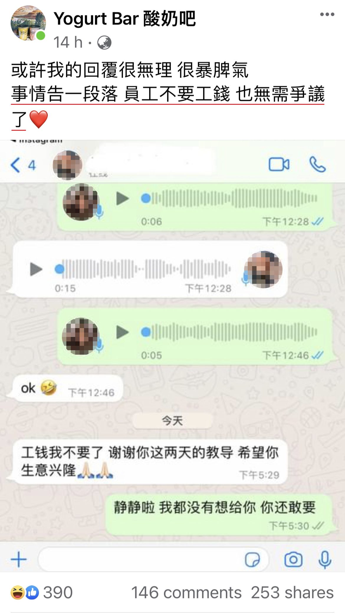 我也不想闹大件事,一开始我就没有 post 这位员工上来,她恶人先告状 post FB,大家也给出一些关于劳工与职业的知识建议。这位员工就在刚才喊妈妈,打电话来闹事;有点突然,完全没有录音。