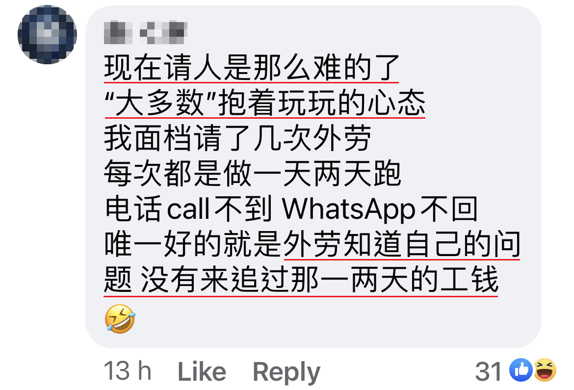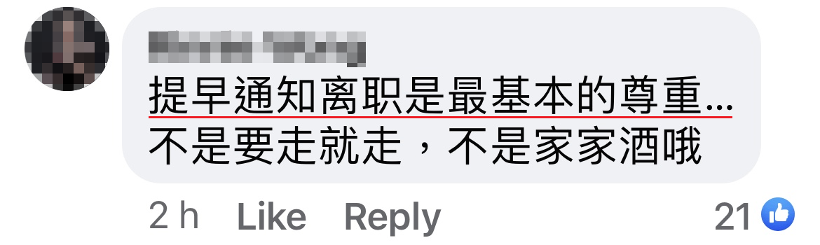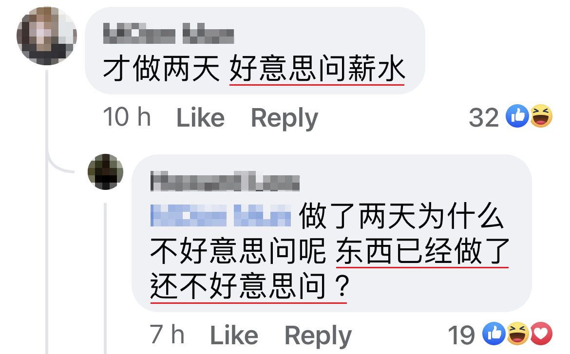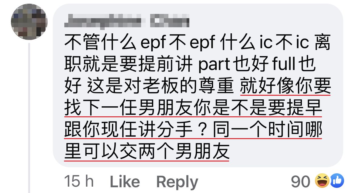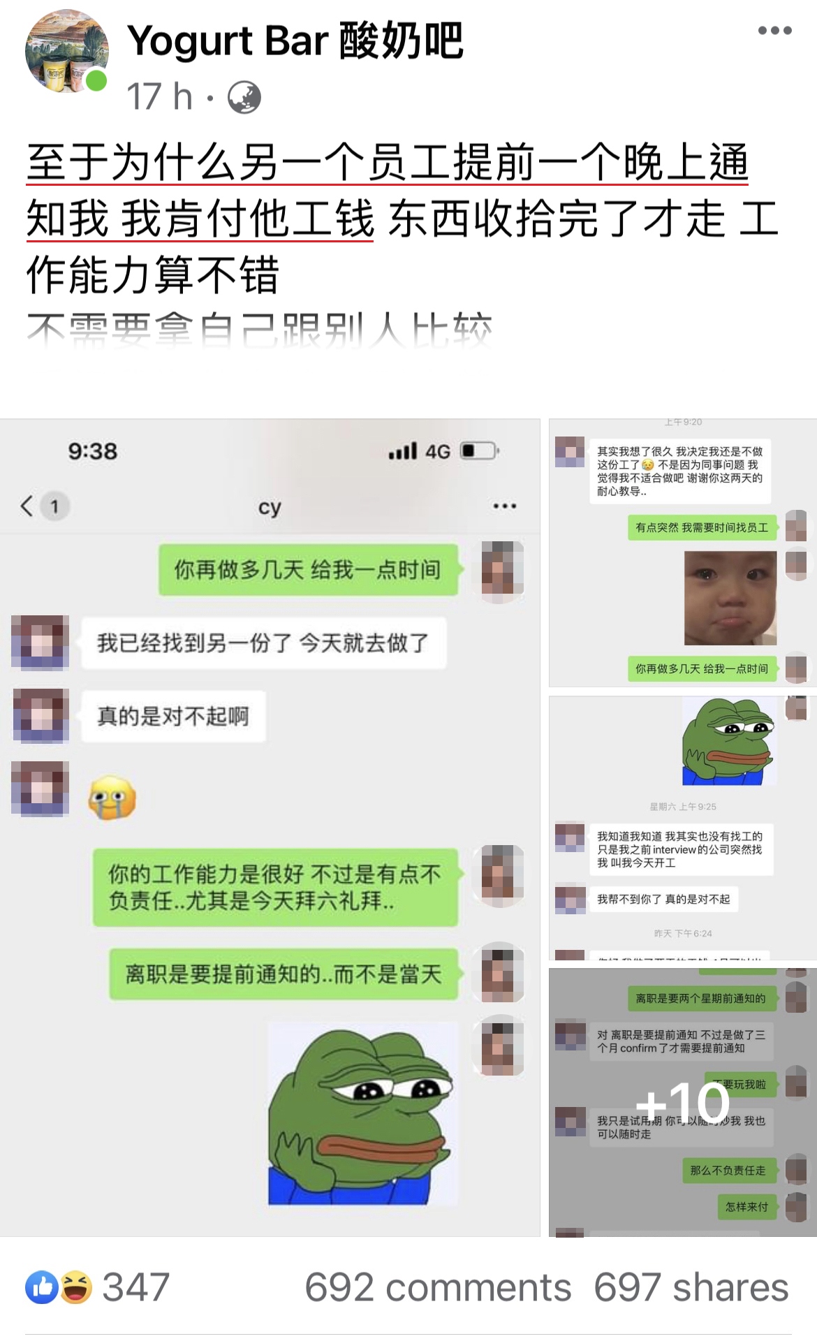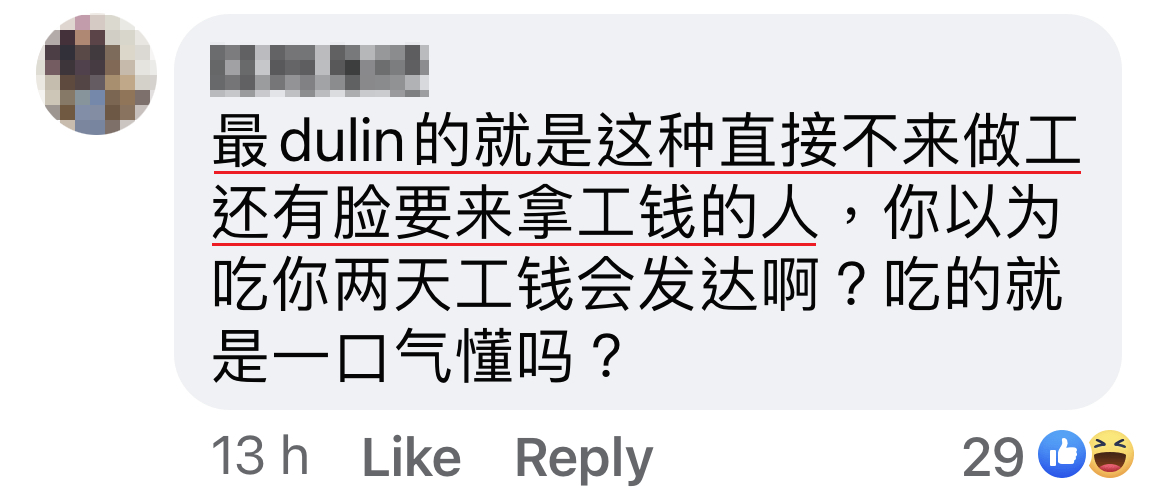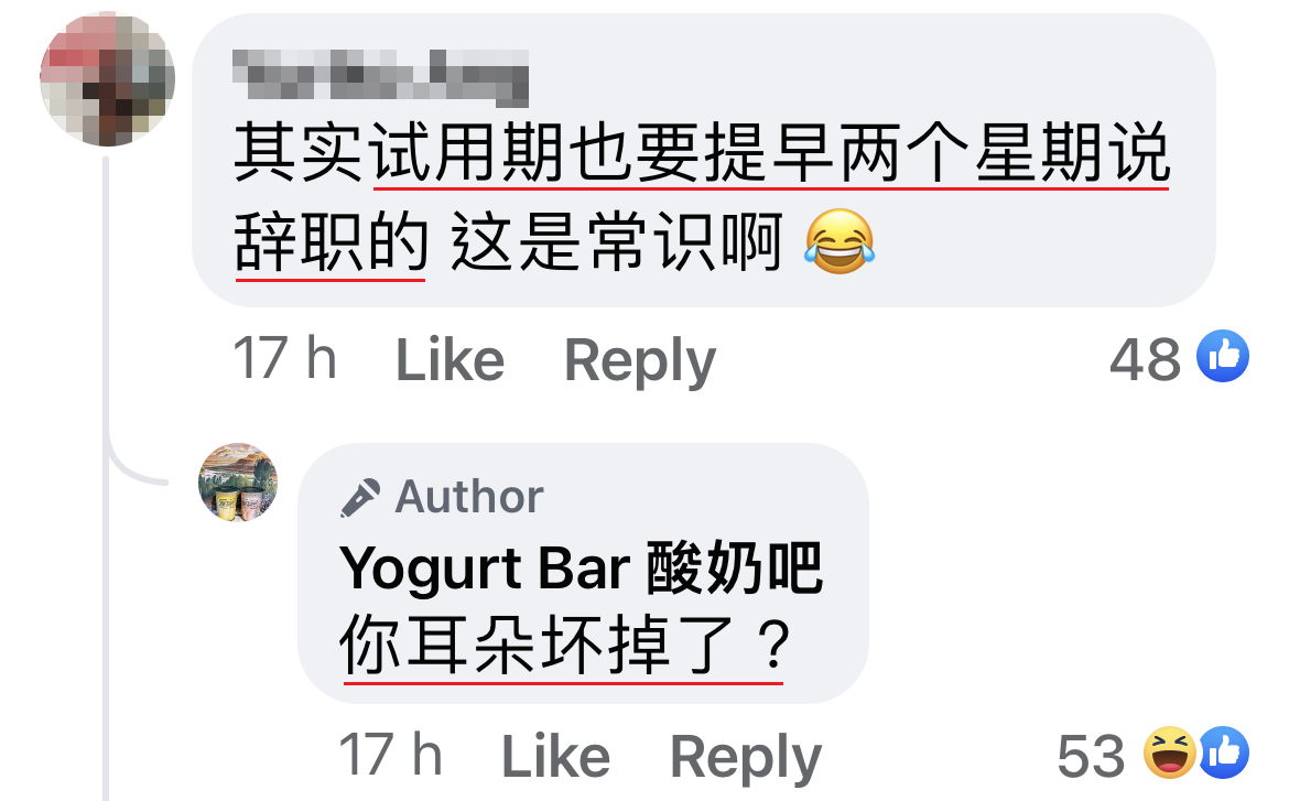 我也不想闹大件事,一开始我就没有 post 这位员工上来,她恶人先告状 post FB,大家也给出一些关于劳工与职业的知识建议。这位员工就在刚才喊妈妈,打电话来闹事;有点突然,完全没有录音。