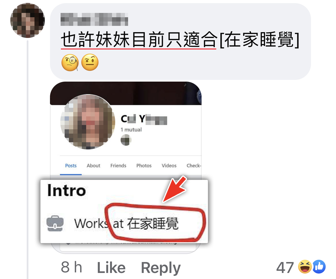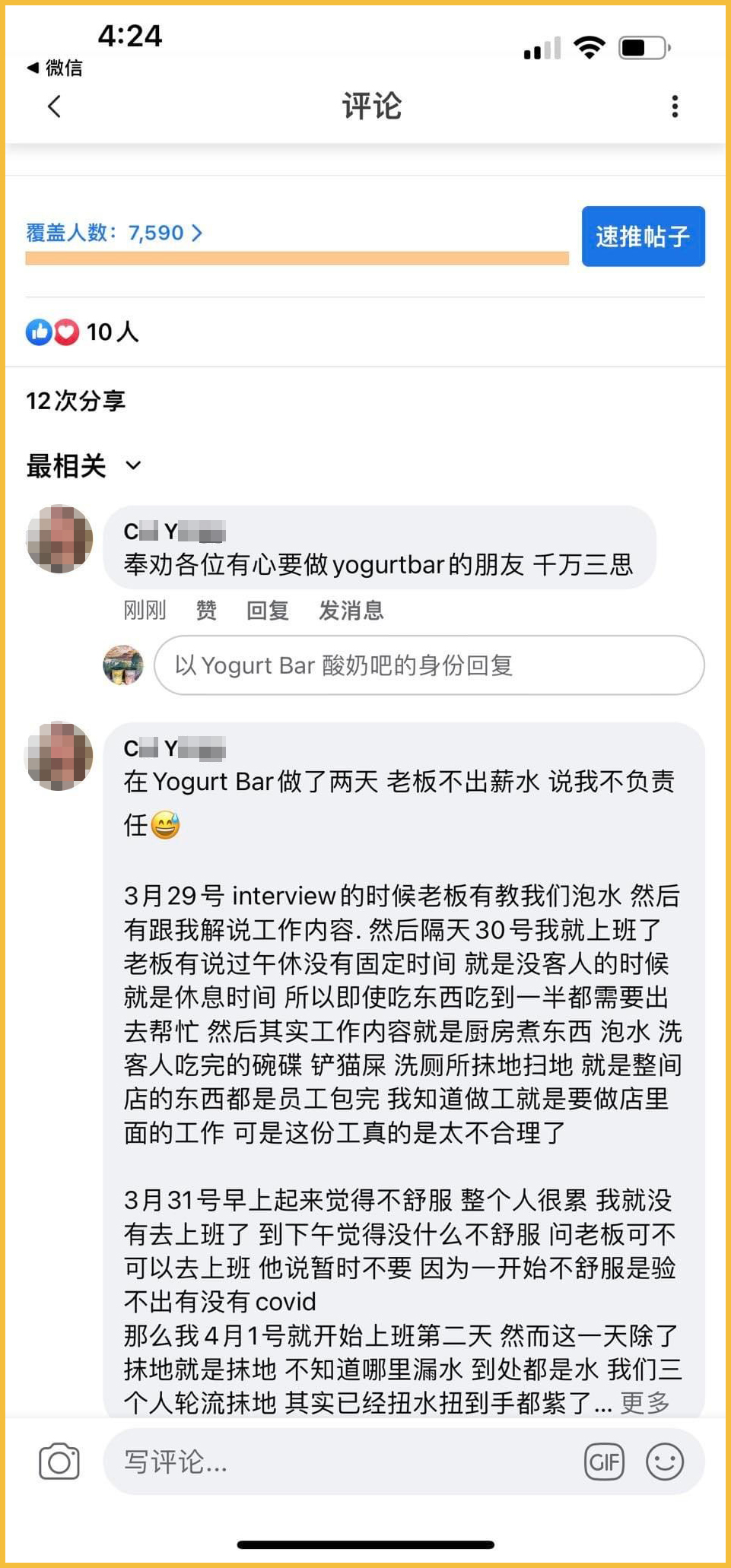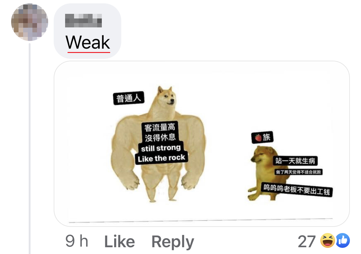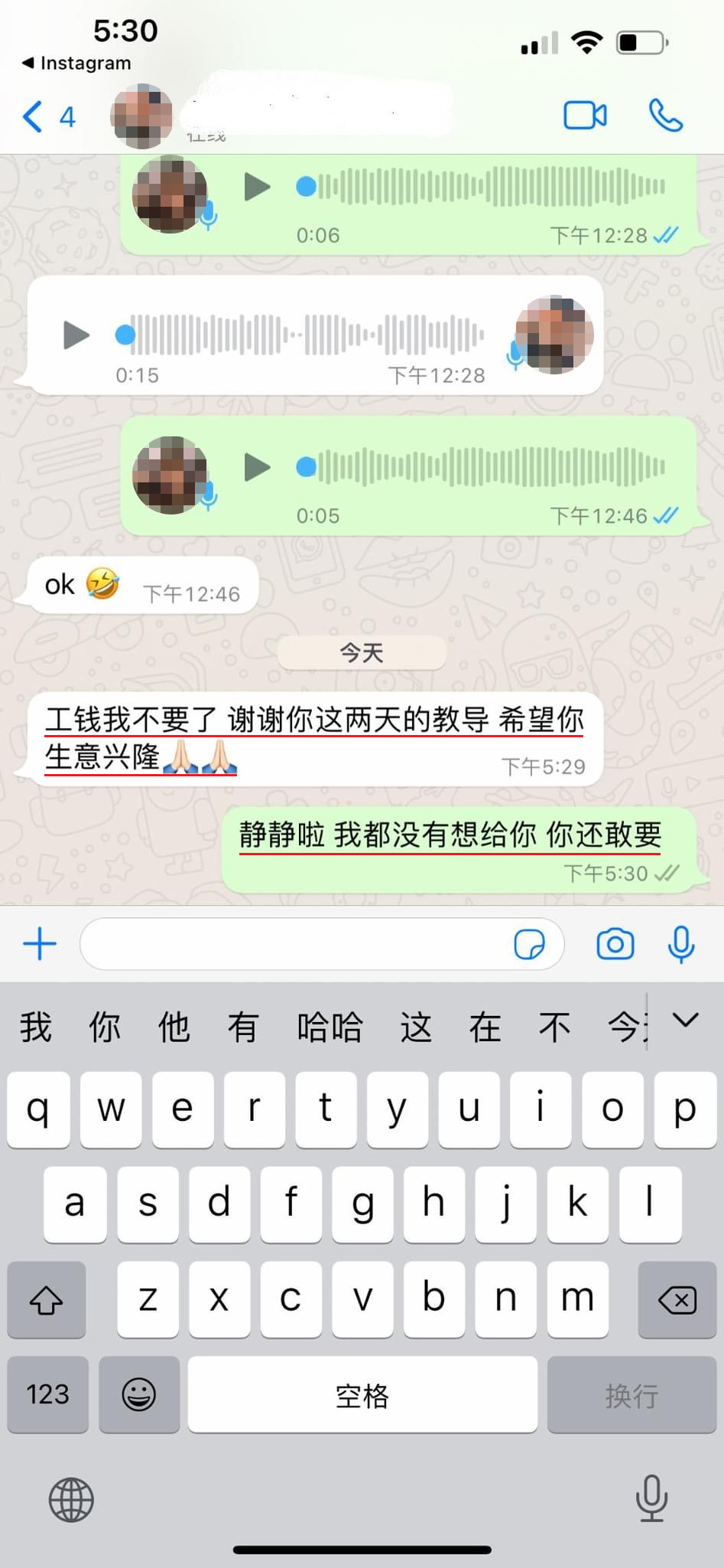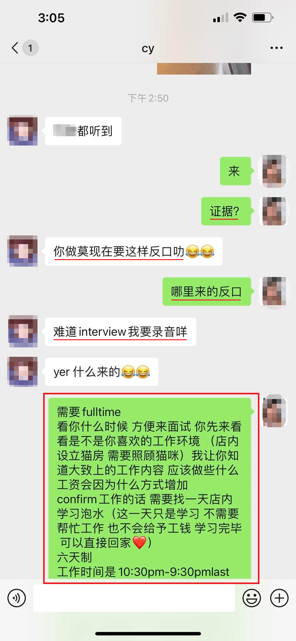 我也不想闹大件事,一开始我就没有 post 这位员工上来,她恶人先告状 post FB,大家也给出一些关于劳工与职业的知识建议。这位员工就在刚才喊妈妈,打电话来闹事;有点突然,完全没有录音。