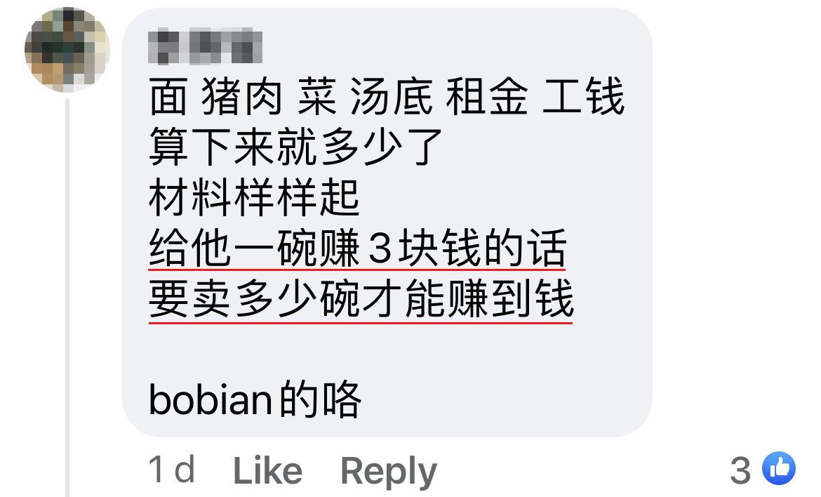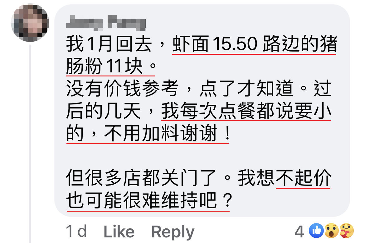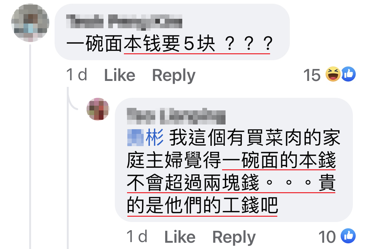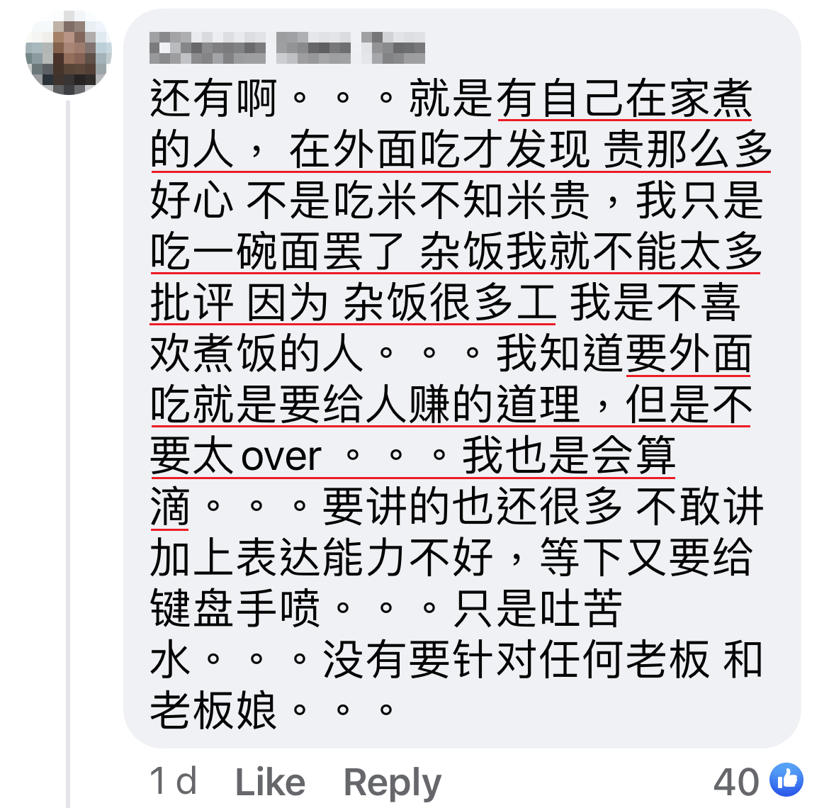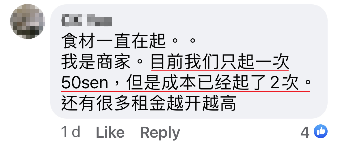然而这篇帖文在群里引发了另一个视角的言论,同样做为消费者的另一名网友则PO文为小贩们、商家们打抱不平,仔细地分析出饮食业涨价的原因。