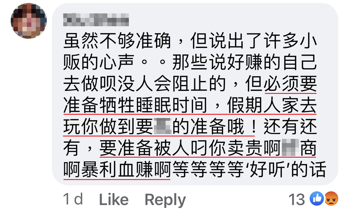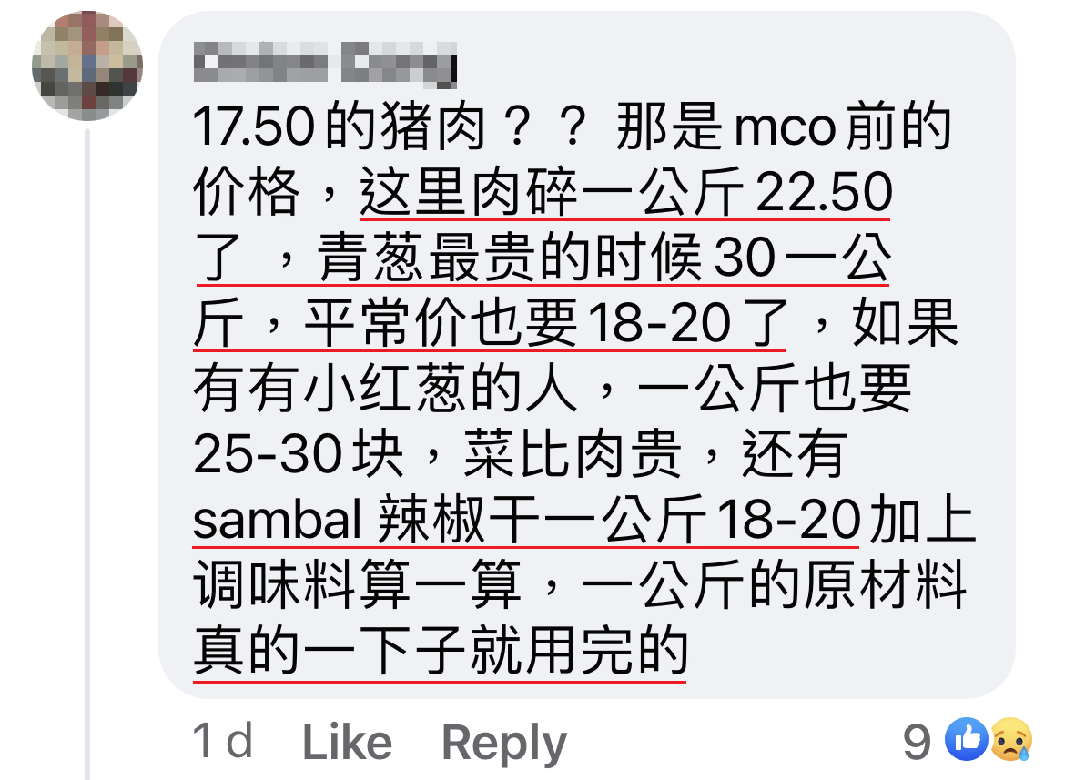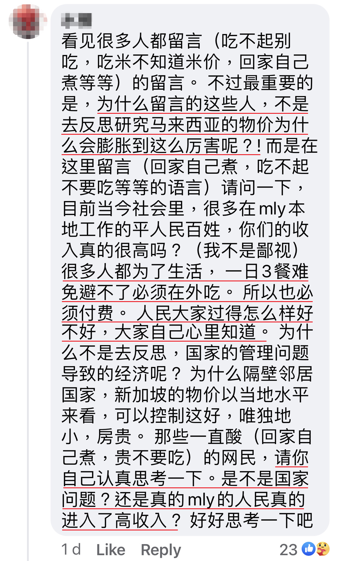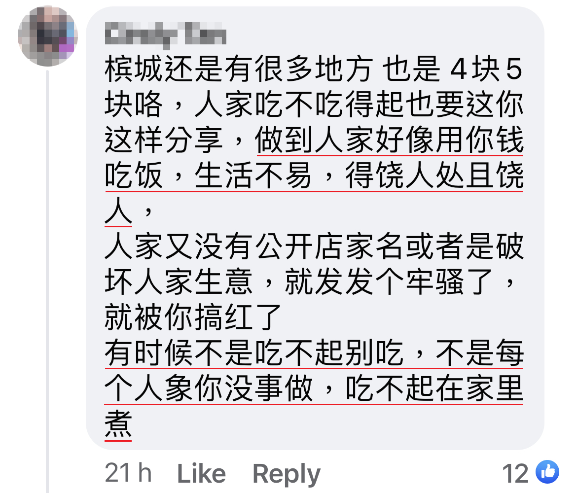 然而这篇帖文在群里引发了另一个视角的言论,同样做为消费者的另一名网友则PO文为小贩们、商家们打抱不平,仔细地分析出饮食业涨价的原因。
