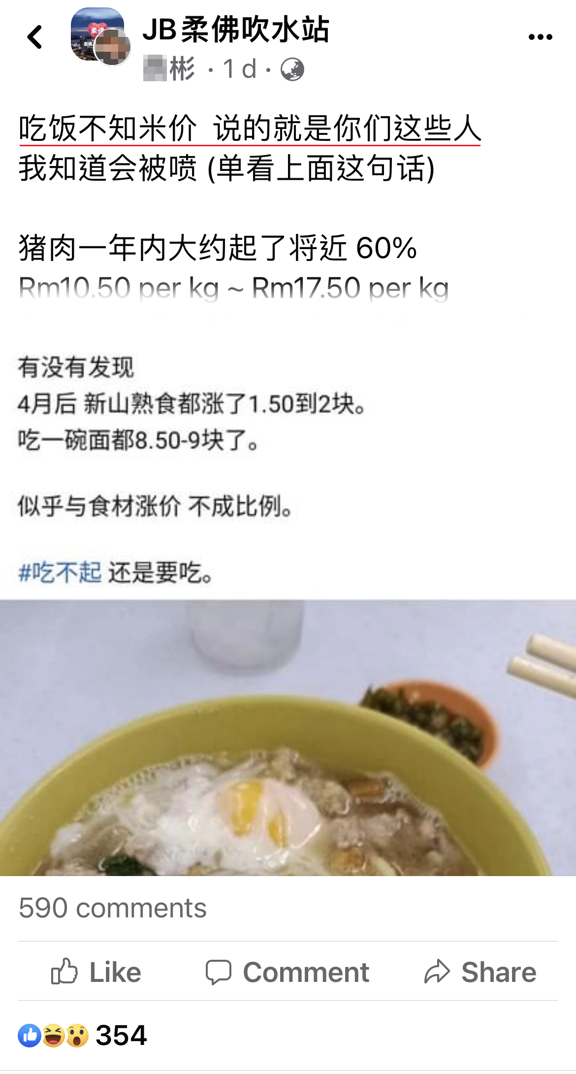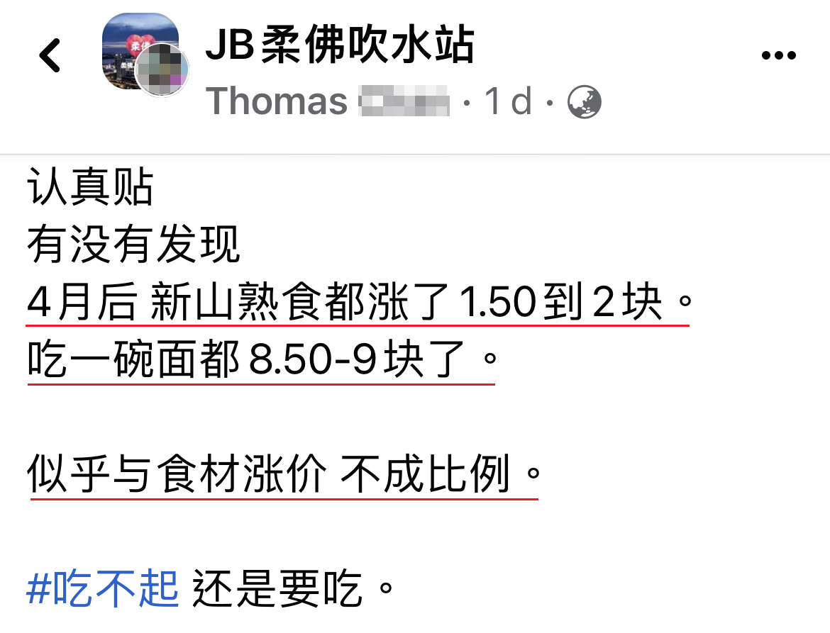 根据网友在“吹水站”的分享,4月份以后柔佛新山很多地方的熟食都起价了RM1.50-RM2,现在普普通通一碗面就要将近RM9,网友无奈地表示:「吃不起还是要吃。」