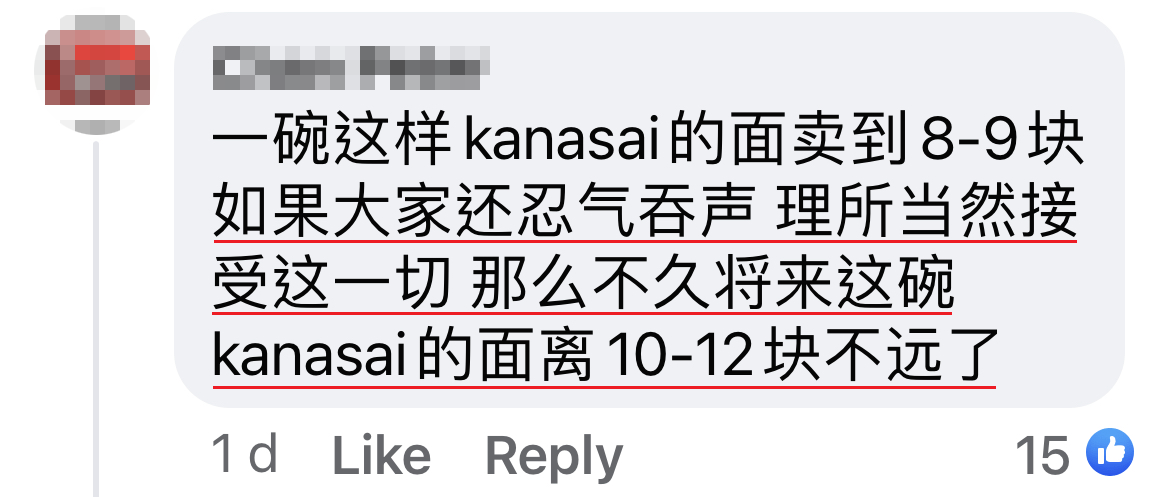 我针对的是:正常市场价格却喊贵的人。那些吃一碗面RM10-20的,我不知道你们的用料是什么,不予评价,But 是真的贵!