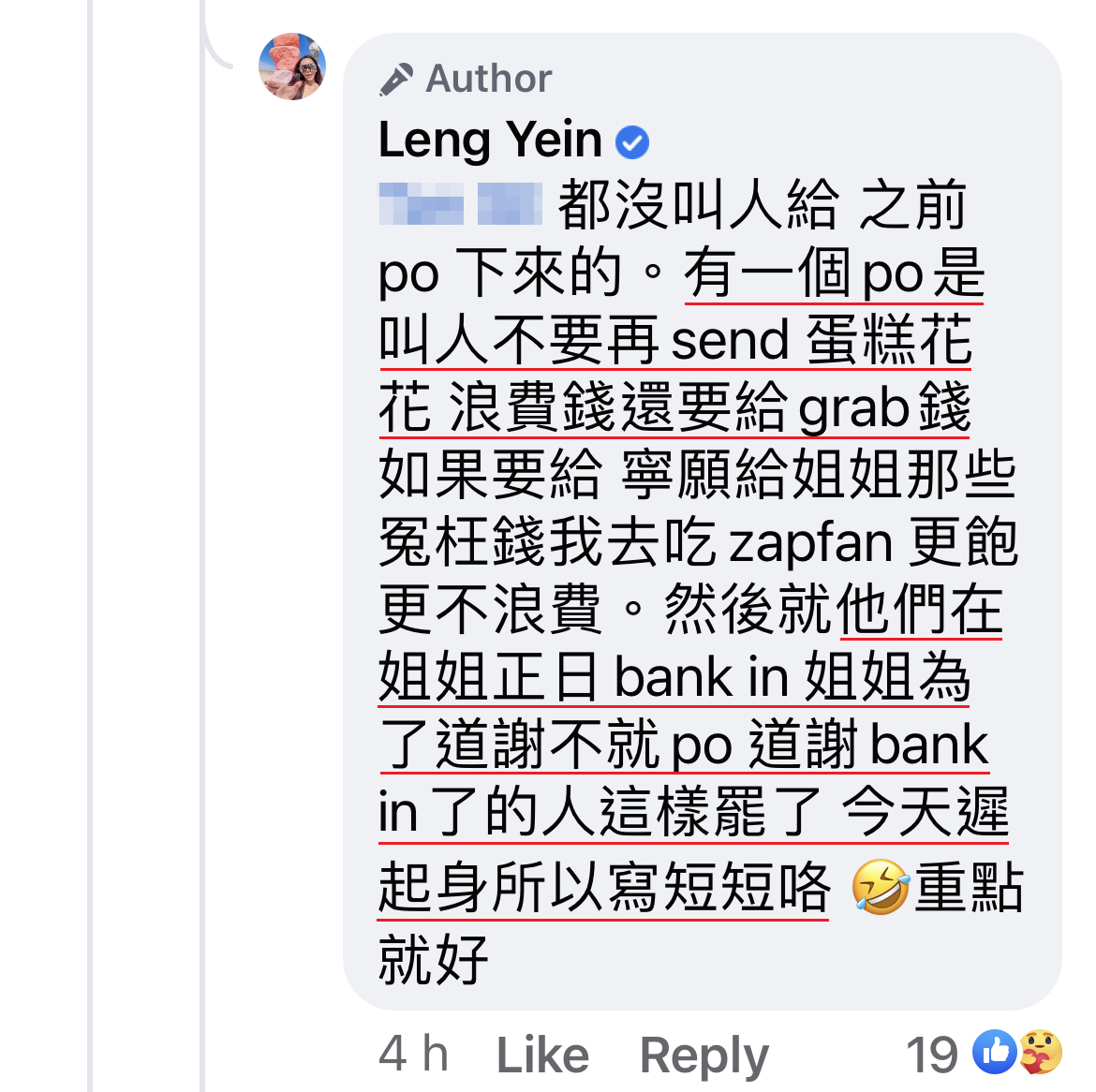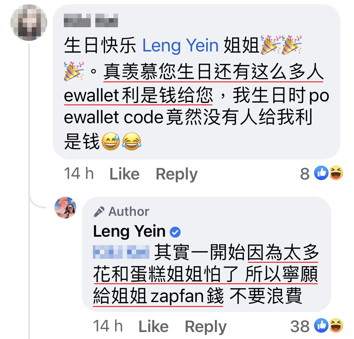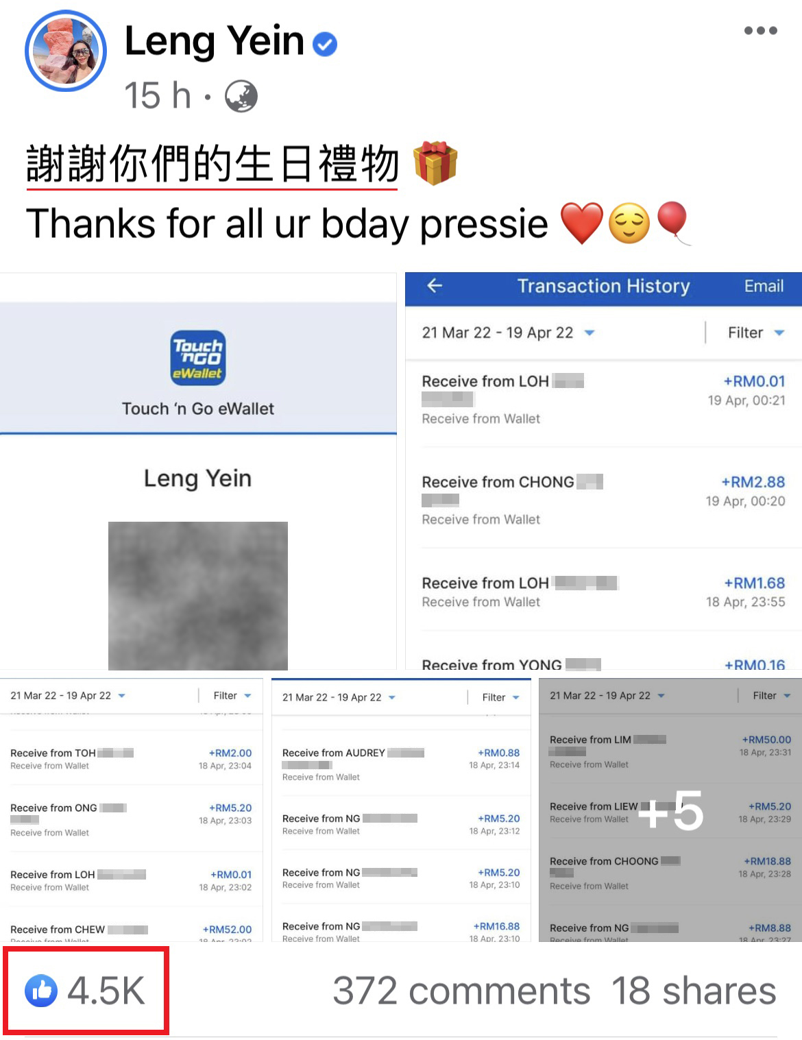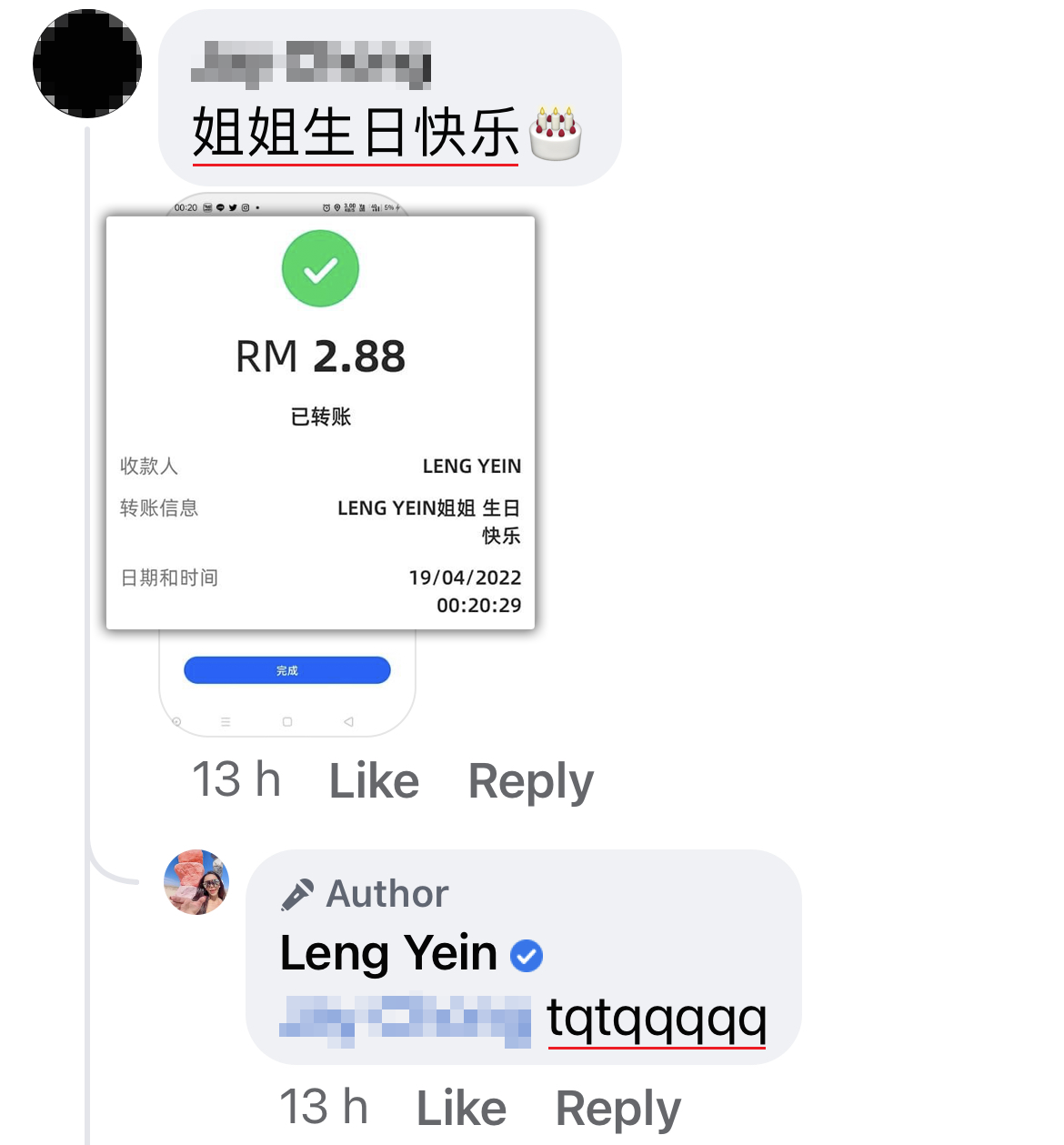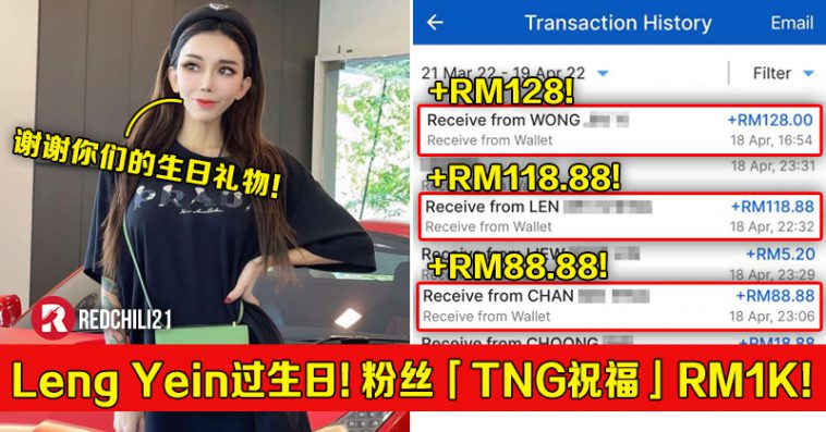 昨天4月18日是大马网红 Leng Yein 的生日,在脸书拥有近3百万粉丝的她,收到了来自众多网友的祝福红包,光是 TNG 转账就破千了!
