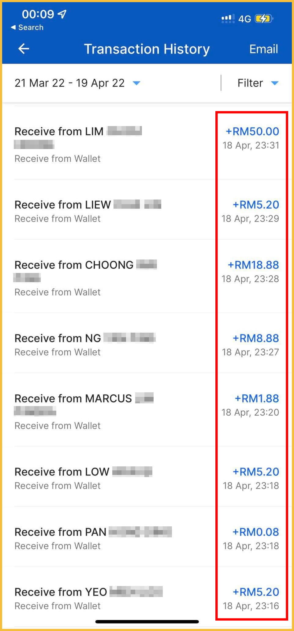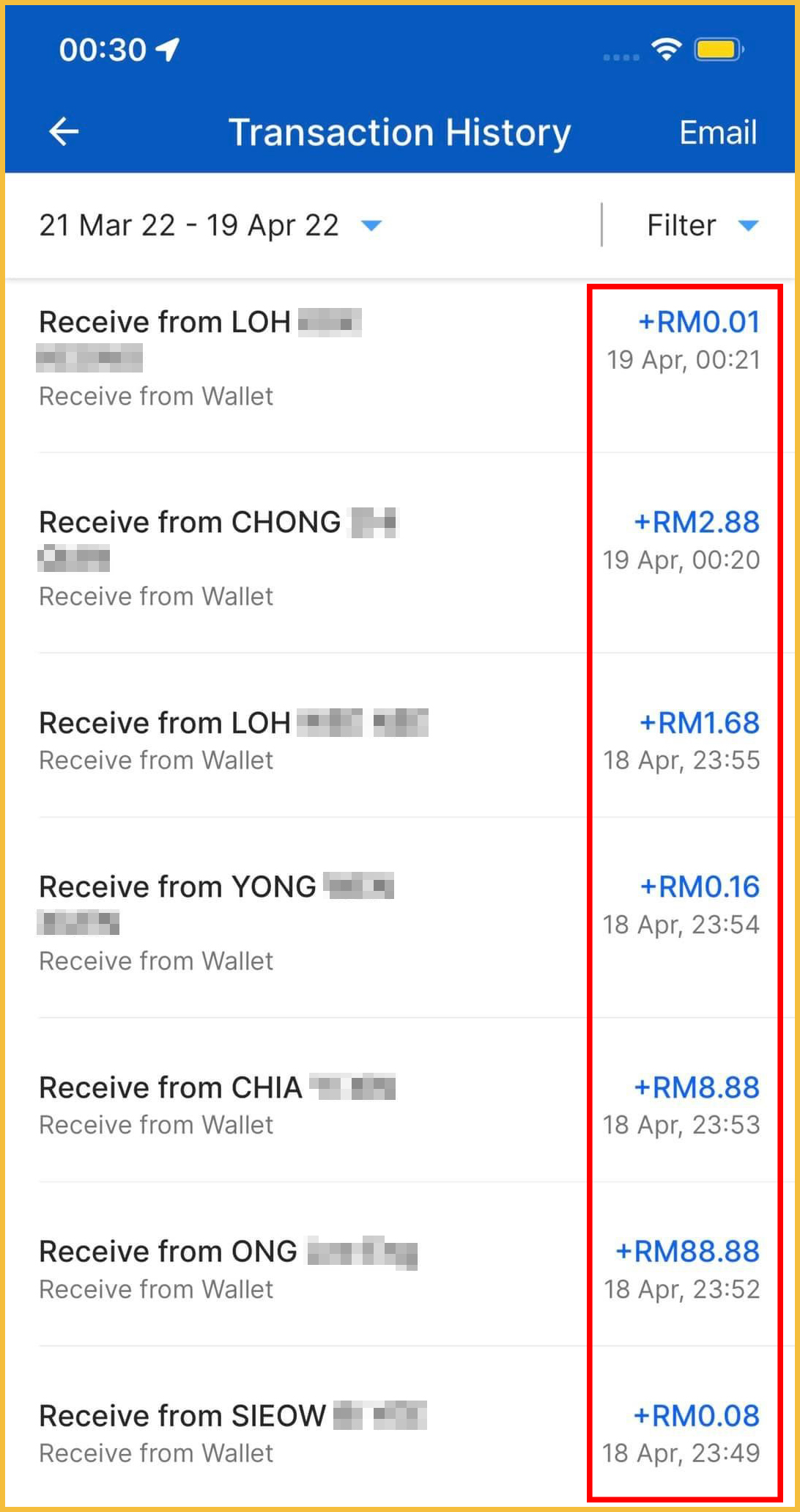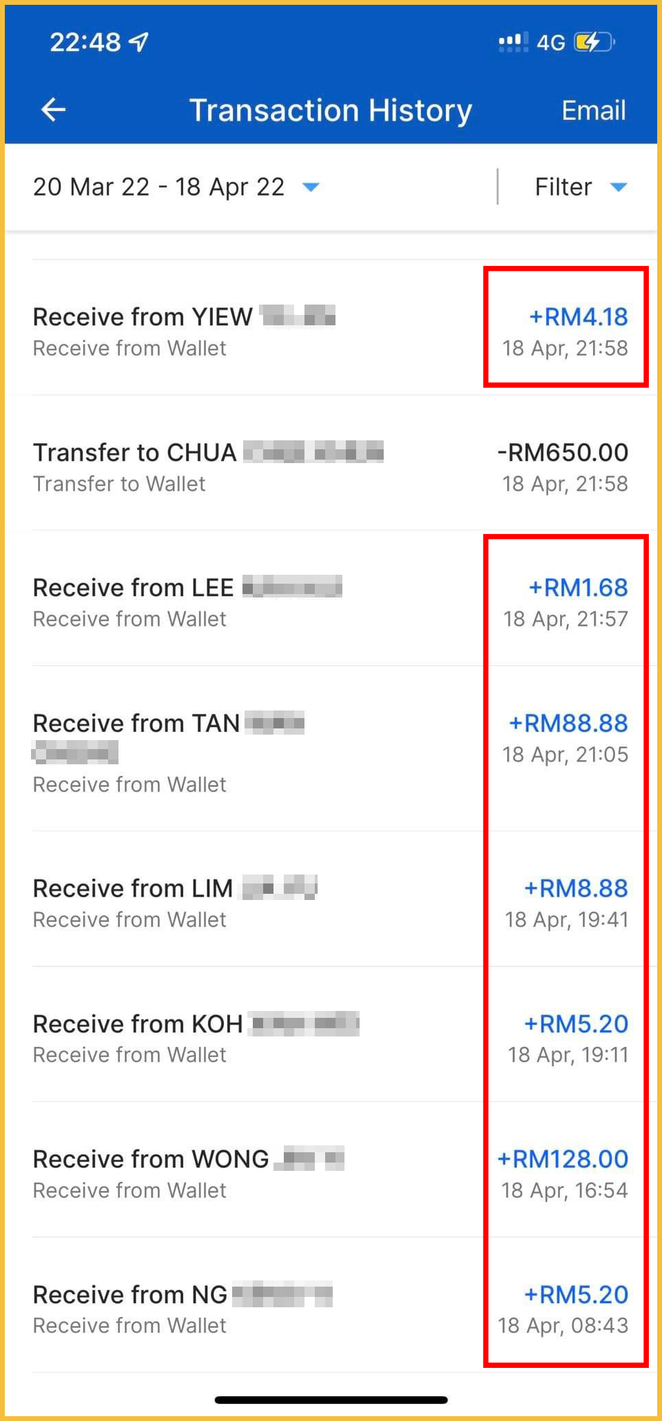 ▼ Leng Yein 的 TNG 转账记录截图 ② :RM138.15