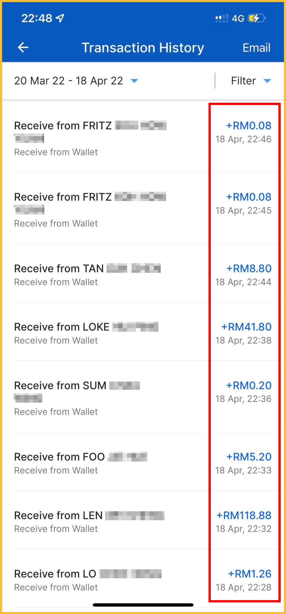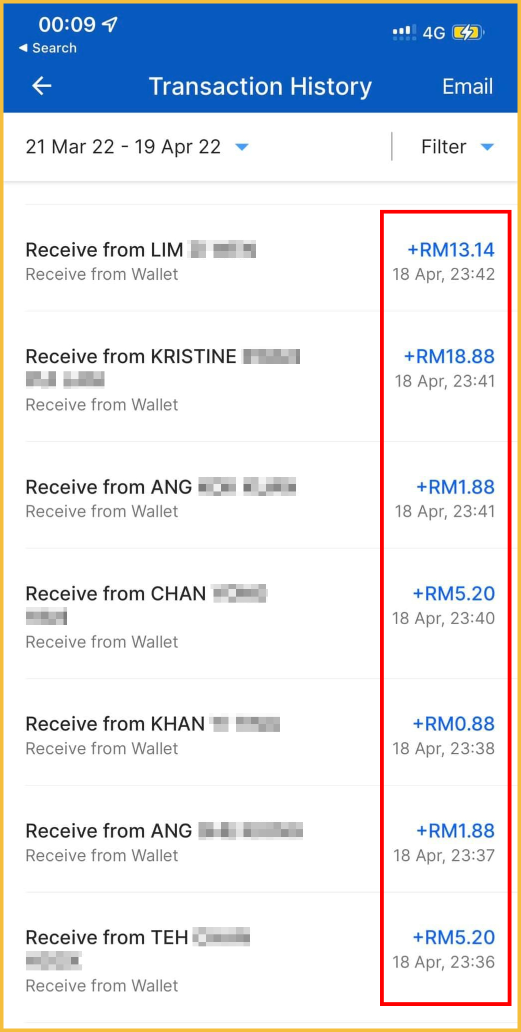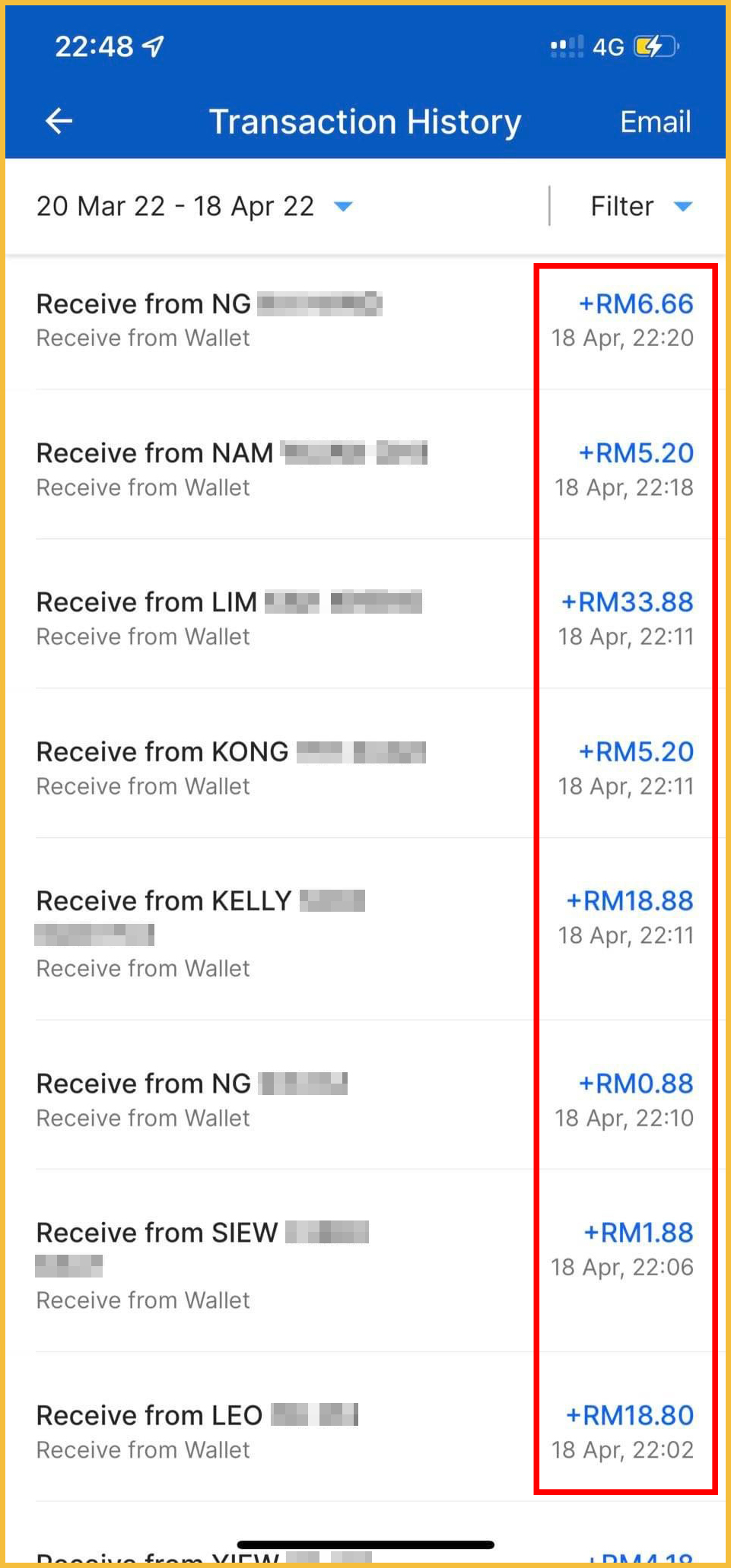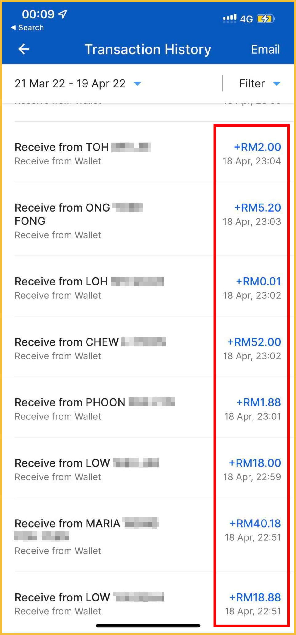 ▼ Leng Yein 的 TNG 转账记录截图 ② :RM138.15