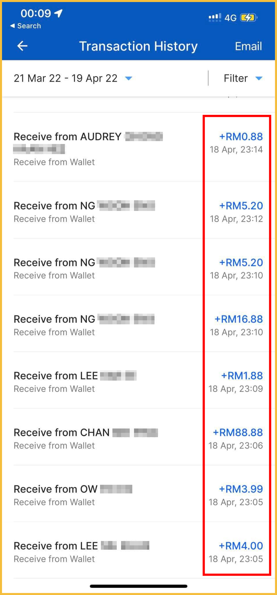 ▼ Leng Yein 的 TNG 转账记录截图 ④ :RM95.32