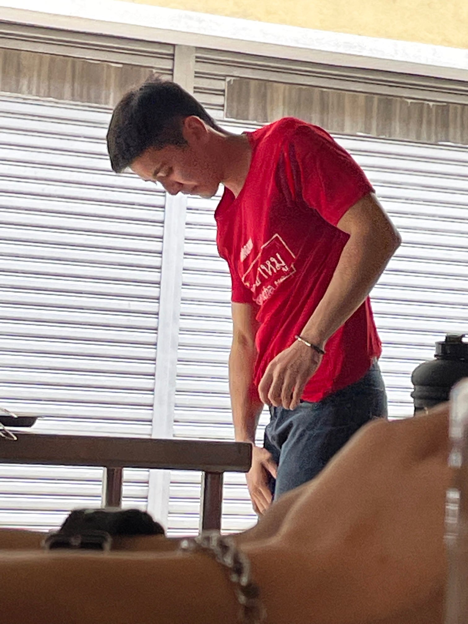 ▼ 新开张的泰国曼谷猪脚饭档口就在巴生的一家咖啡店里,照片中忙着做生意的型男身穿红色上衣、围着围裙还有低调的黑色鸭舌帽。